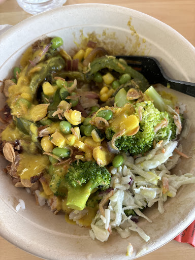 My friend had a bowl of brown rice, chicken, broccoli, sautéed onion and pepper, seaweed salad, pickled carrots, kimchi cucumber and several sauces.