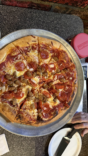 The aroma of hot pizza filled the air, the restaurant was dark and had a few tables of patrons on Saturday night. It was close to what it is listed online as their closing time. But they did have a sign on the door stating that certain nights of the week they will be open till 830 to accommodate larger weekend crowds. The waitress that took a drink order was very nice and polite. The waitress that took her food order did not pick up the cues that it was our first time in the restaurant. We did order a 14 inch large pepperoni pizza and a half does an order of chicken wings, barbecue flavor. Our drinks came out in massive cups with lots of small bits of ice that was fantastic! The pizza came out and was steamy and you could tell the cheese was very well, melted! And the waitress did tell us would be a few more minutes on the wings, and we understood because they were not listed as an appetizer. They were simply on the menu as an item you could order. Then moments later, we heard her from the kitchen asking if they forgot about cooking the wings. Thankfully, they did not as they arrived Just moments later. The weight staff did stop by several times throughout us eating to check on our drinks to see if we need refills or anything. We did ask for some ranch. We were informed that it is $1.50 extra for the ranch. I totally understand food establishments having to charge for every item that goes out because it costs them to have on hand. Over all the pizza as hot and cheesy. Personally we like pepperoni to be a bit crispy on pizza. We were full from the pizza and had to take the wings home… 4 hours later and we still haven’t eaten the wings! One 14” pizza fed family of 3...