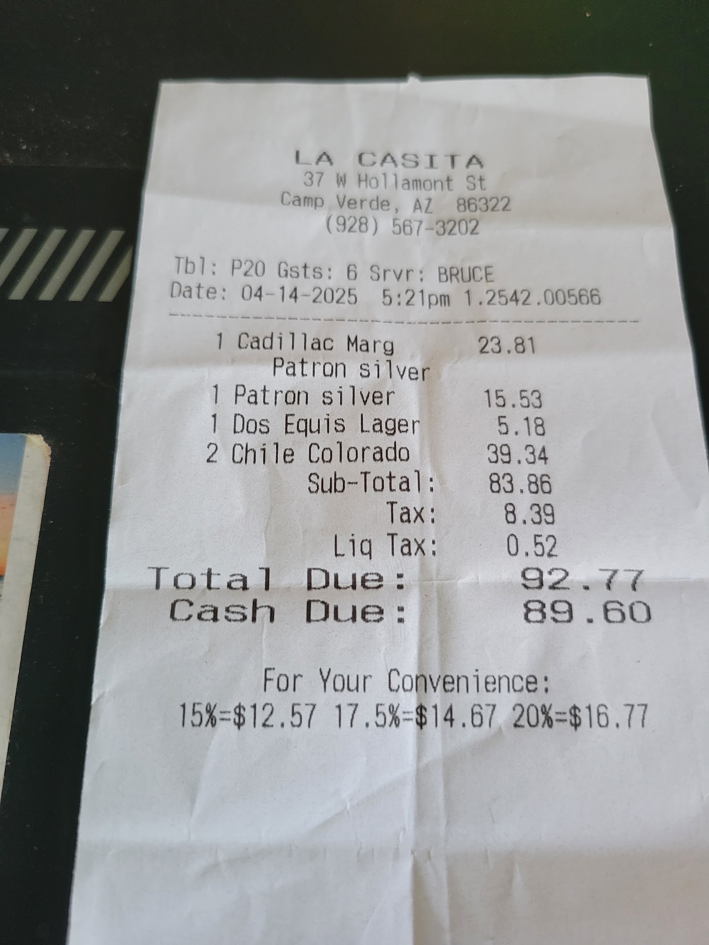 I ordered a skinny margarita, as I usually do, but it was served in an oversized goblet—not the way it’s typically presented at this restaurant. When I told Bruce it wasn’t what I ordered, he took it away and returned within a minute—with the exact type glass. He never came back to check on us, which at that point was probably for the best. I had wanted to order another drink and specify but trying to communicate with him was incredibly difficult. When I attempted to ask about the tequila options, he abruptly tossed the tequila menu in front of me and said, “What type tequila do you want?” Out of frustration, I just said Patron Reposado. To make matters worse, my husband asked for a martini, and Bruce told him he didn’t make those—despite us having been served one at the same restaurant just a month earlier. The inconsistency was baffling. The food, as always, was excellent, but when the bill arrived, I was shocked to see I had been charged $23.81 for a margarita—more than I’ve paid at high-end establishments like the Four Seasons or Disney. (see receipt) As someone who used to work in the industry as a bartender, I understand how service should look, and this was unacceptable, especially when the restaurant wasn’t busy. Bruce’s service turned what should have been an enjoyable night out into a very disappointing experience, one we are still telling our friends about. If we do decide to return in the future, it will be with a clear request for a...