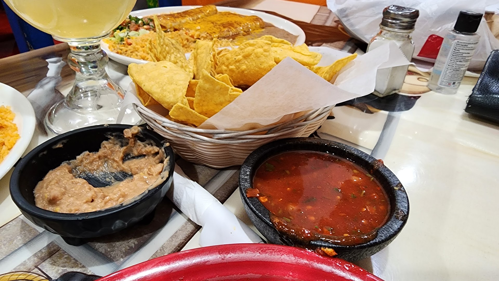 The service wasn't up to par. Our margaritas didn't arrive until our food arrived. Apparently, they'd run out of glasses. A bit odd, but okay. However, our water wasn't brought out, and we had to ask about the status of the margaritas after 15+ minutes had gone by. The server had to ask for them to be remade because they'd been served to another table. Then, when we got them, they weren't what we'd ordered. The food arrived, but we had to ask for napkins and silverware. The server never checked with us to see if everything was okay. By the time she did come back, my meal was finished. My boyfriend asked for more tortillas - ten plus minutes later, we hadn't gotten them. At that point, we asked for our ticket. Another 10-15 minutes went by. We received the ticket and had been charged for the drinks despite them being incorrect and one of them left untouched. The other one was tried, but abandoned.