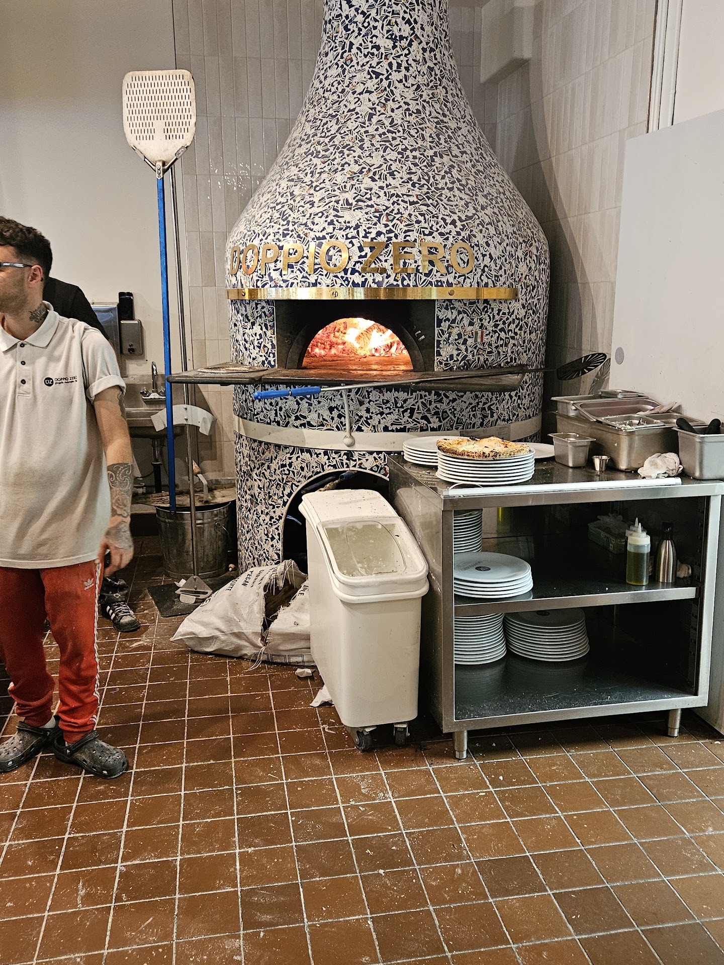 Doppio Zero: The proferred ingredients are: Burrata cheese, 24 months Prosciutto di Parma, arugula, shaved Parmigiano Reggiano, E.V.O.O. It's a mouthwatering, excellent pie with the perfect amount of each ingredient evenly distributed, including a tasty high quality Prosciutto! Obviously none of the pesky San Marzanos, but the same overly soft and floppy crust.