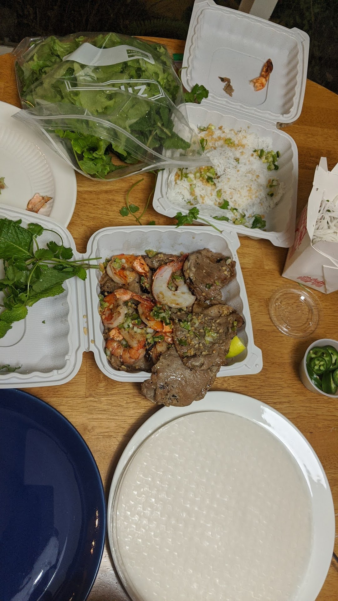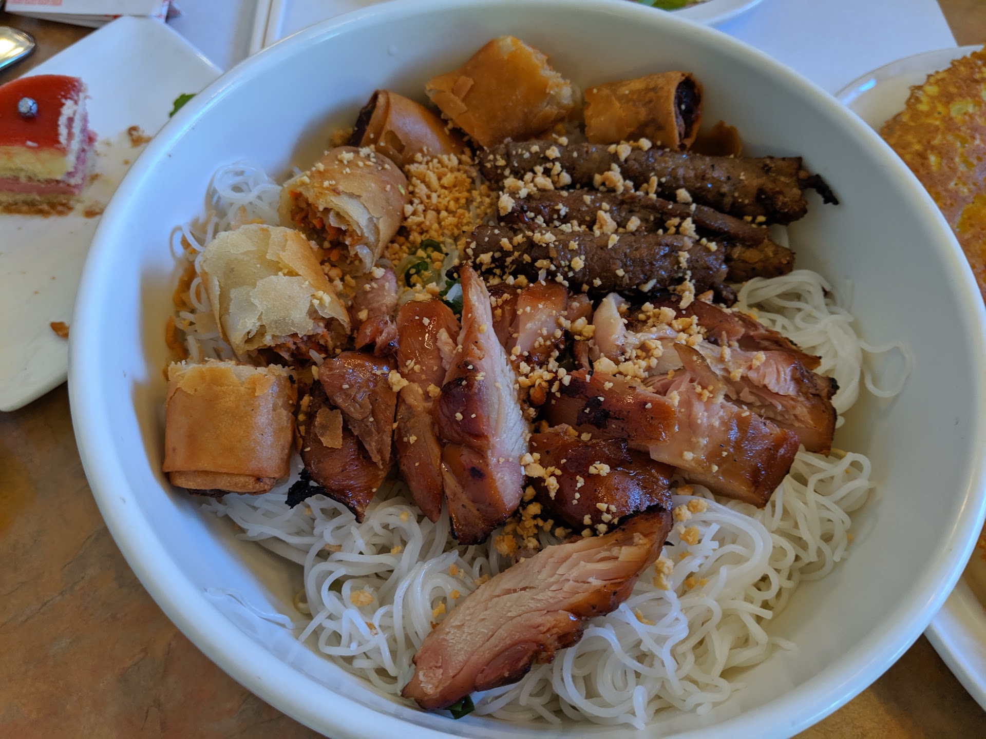 No need to comment on the drinks. The veggie egg rolls tasted like they almost always taste. And kudos to them for making sure each of us had our own set of two sauces. The meatloaf was unexpectedly good, if a bit stingy on the assorted vegetable and herbs that accompanied it. I ordered the grilled beef onion rolls because that was always a favorite of mine at Vung Tau. These both suffered and succeeded in comparison. They were like toothpicks, whereas Vung’s were quite a bit more substantial and tied with the green onion. That said, they were flavorful and came with an odd smattering of lettuce and cherry tomatoes (some of which got soggy in the sauce and from the heat). The chicken was indeed aromatic and tasty, even if it was barely peeking out of the already small bowl in which it was placed. The shaken beef was perhaps the most flavorful of all our entrees. The meat was tender enough and came with a smattering of grilled onions, mushrooms, and bell peppers . . . and, again, those odd pieces of lettuce and tomatoes that suffered from the residual heat of the main part of the dish. Suggestion? Place things like this to the side if the main is hot. Their fried rice is not hard-cooked fried rice. That said, it contains quite a few peas, carrots, and baby shrimp. But it also had little to no discernible taste, save for when the other items (and some low-sodium soy sauce) were introduced.