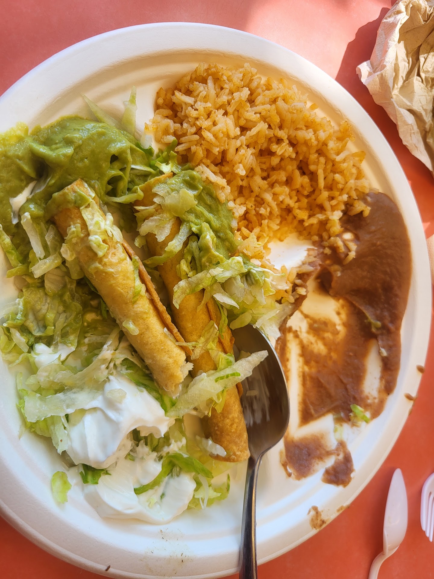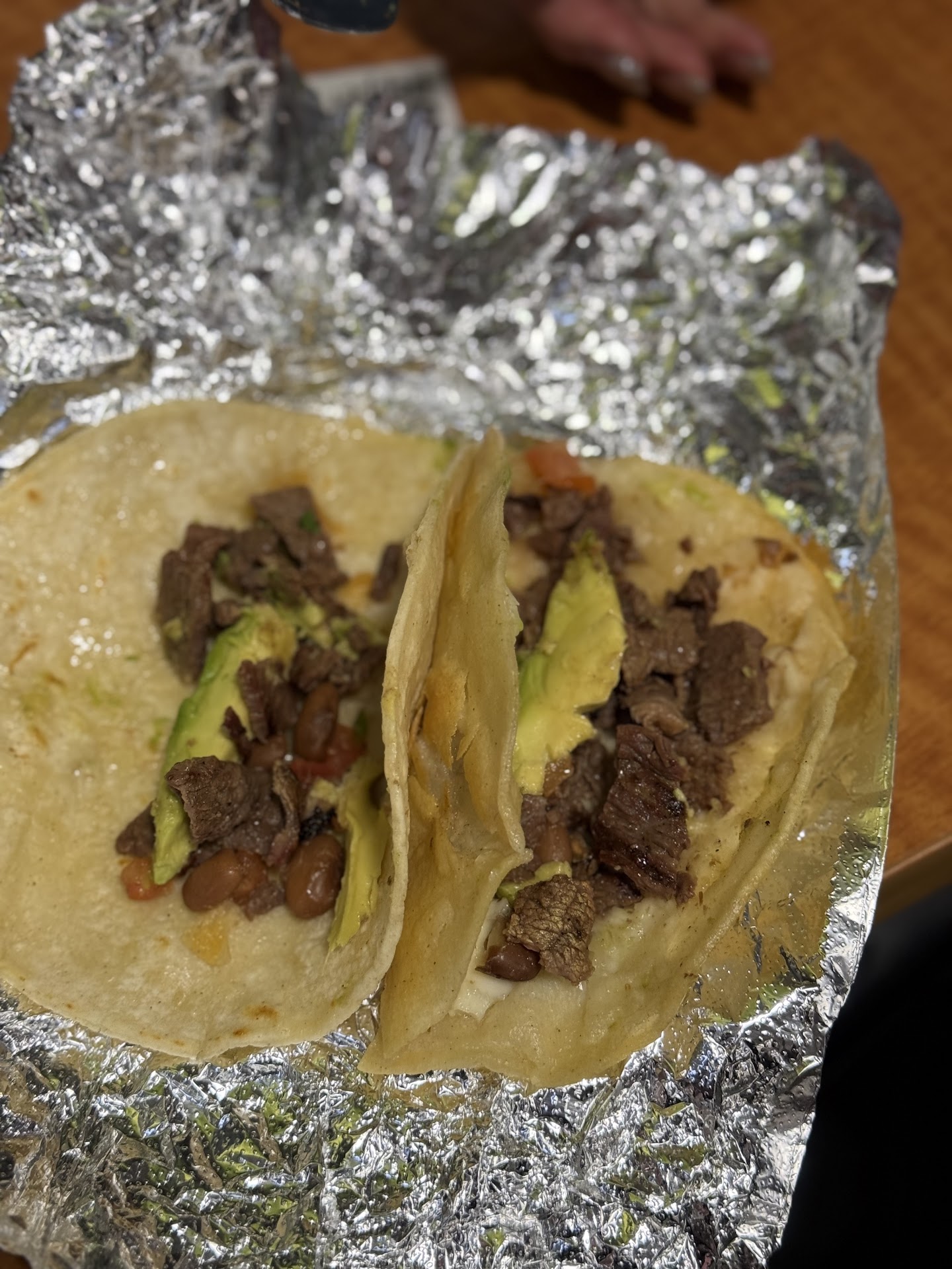 Read moreThe super tacos are amazing- generous slices of avocado and shredded cheese, on top of the usual salsa, meat and whole pinto beans, served in two corn tortillas each. Two make up a very decent, filling meal.