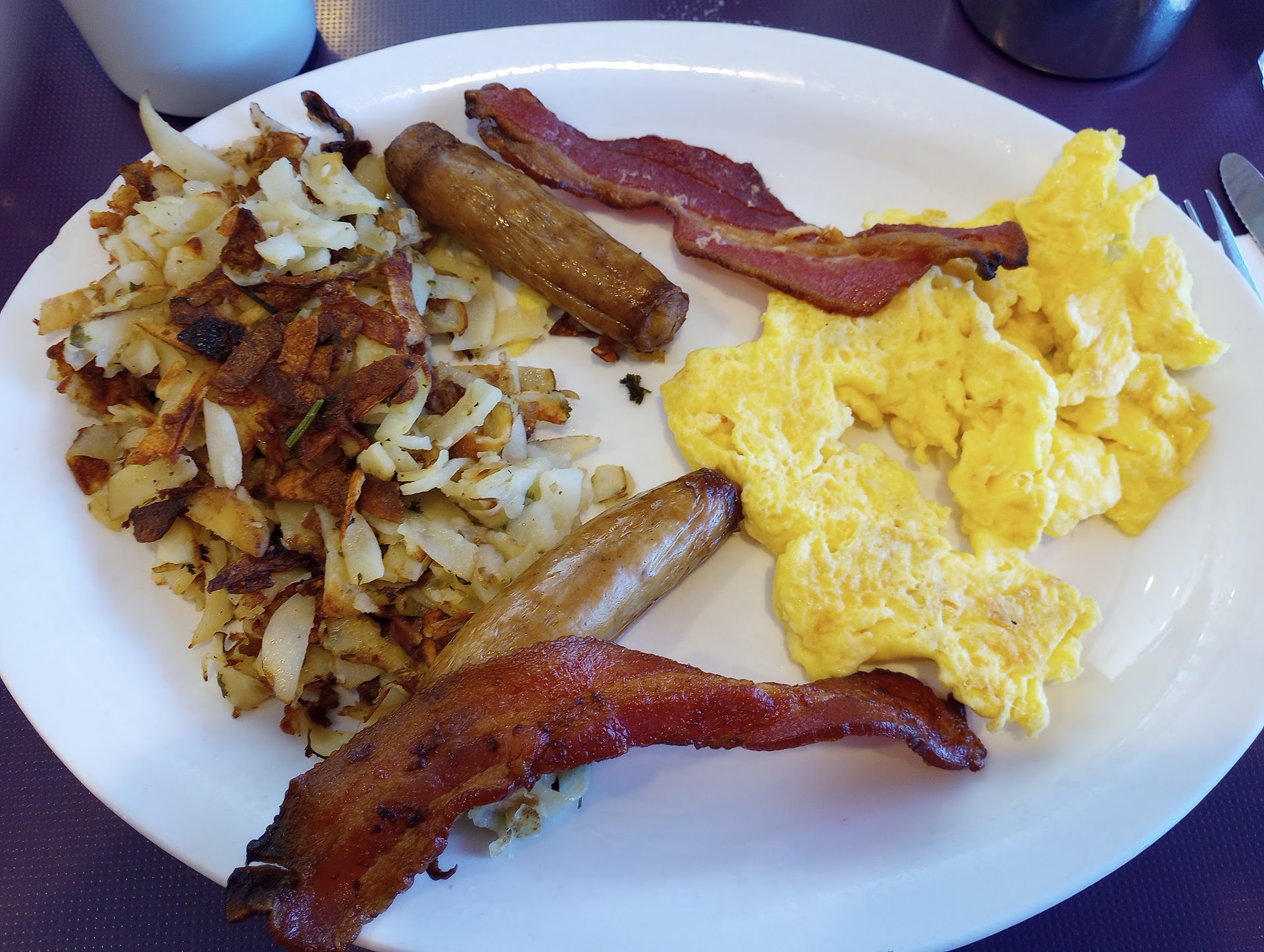 Read moreFirst time back since the world crashed. Had the 2 egg special with bacon (four pieces), potatoes, and toasted English muffin. My meal was lukewarm like it had been setting for awhile after being cooked. First it was my fault for not being specific, but the bacon didn't appear to be done (I forgot to ask for crisp) and the muffin was less than toasted, with a bit of butter in the middle of both halves. The bacon came back with two pieces crisp and two pieces rubbery/chewy; and it tasted like shoe leather, not salty/meaty bacon taste. Their potatoes are good but would be better if they were hot or even warm. My over easy eggs were done perfectly. There was a lot food on my plate. I left the bacon, all but one bite of the muffin, and half the potatoes. The server asked if I wanted a to-go box, I just said no since I'm traveling and I didn't think I could make it better after the fact.