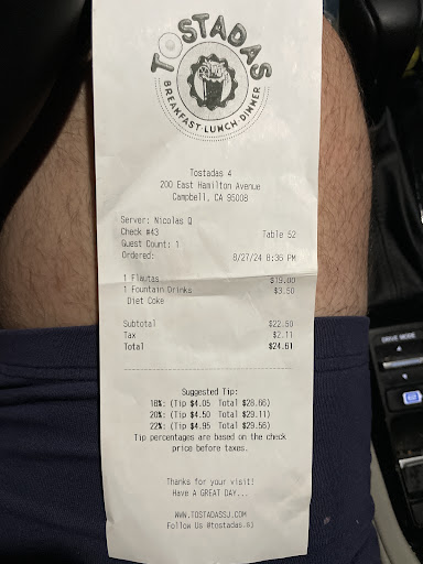 Why you didn't state that before I walked out of the place I went directly to you to let you know that I had left $30.00 cash on the table because I didn't want to get anything for free? My order was (a Mexican Benedict for $16 + a Cafe de Olla for $3.95), doing the math that was about $21.94 with taxes included. So the $30.00 I left on the table was not enough to pay for my meal? My question; What did happen with the $30.00 that I left on the table? As you can see, Tostadas did not comp my bill. Thanks!