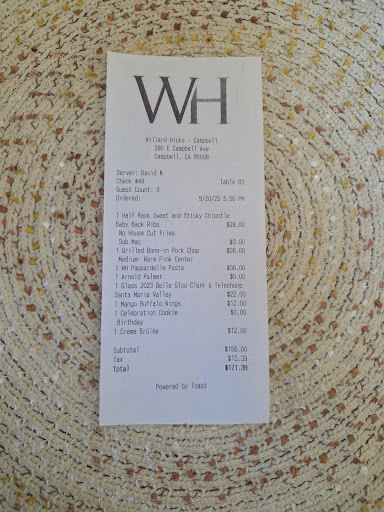 Ā Ā Ā Read moreI took wifey here for our anniversary. When I made our reservations the person asked if it was for a special occasion? I said yes for our anniversary and I would like a booth please. When we arrived we were sat at a booth right away. And greeted by our waiter. Our waiter was friendly, had a positive attitude and made some great recommendations. He also was in no way pushing and allowed us to have an enjoyable evening. I ordered the filet mignon, now normally I order Med rare, I told the waiter exactly how I like it and he said thatās actually medium. I told him that I would get it medium as he suggested but if itās not warm pink in the middle then I would send it back. āWhen the steak arrived I cut into it and low and behold IT WAS PERFECT!! I was also torn between getting the mashed potatoes and the stuffed baked potato he looked at me and said trust me get stuffed baked potato so Iād did. Let me tell you that was the best backed potato I have ever had! We also got a seared Ahi appetizer that was just out of this world good!! Wifey ordered the some kind of braised short rib in pasta. I tried the pasta and it was also amazing. For dessert wifey ordered the Key lime pie which was lacking in flavor, was very underwhelming, I ordered the warm chocolate chip cookies with ice cream. The ice cream was good but the cookies were warmed up old stale cookies that were hard as a rock!! I told the waiter about my cookies, he asked me why I didnāt tell him about them instead of having the busboy pick them up? I told him because he was nowhere to be found. He did offer me another dessert but I refused. Overall it was a very pleasant experience however I do believe that the waiter should have not changed me for that terrible desert and at the very least comped us one of our 2 desserts we ordered as it was our anniversary and they knew this., why else would you ask. Bottom I will be back and I will update my review if things are better next time. IMO Willard Hicks should get another chance as for the most part it was a...