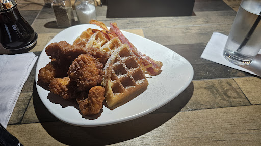 For my meal, I had the chicken and waffles, and I have to say, I’ve never tasted waffles so good! They were slightly sweet on their own, so I didn’t even need much syrup unless I wanted to. The chicken came in small, crispy pieces. While I personally would have preferred bone-in chicken, the flavor still delivered. I do wish they had a traditional hot sauce option, but Wilder, my attentive server, was able to bring out a hot sauce mixed with mayonnaise, which worked for the moment. Still, a classic hot sauce addition would be a wonderful touch for those who like a little extra spice!