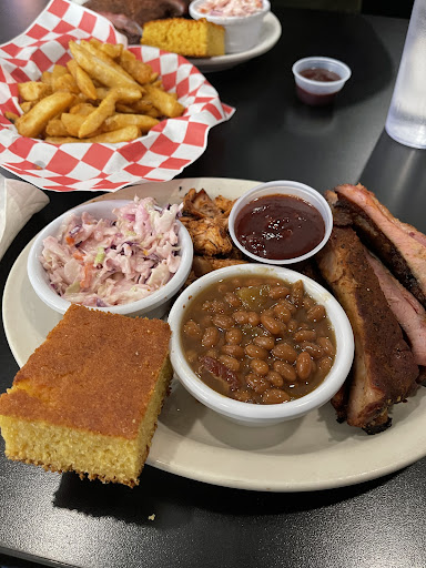 Read moreFirst time for us, but wont be a last!!! Honestly we had difficulty in picking our meals, everything sounded so good!!! I ended up with the 2 meat combo, ribs and pulled chicken. My sides were the apple baked beans and slaw. He got half rack of ribs, baked spud and slaw! Our server was helpful in describing sides, vinegar slaw etc. As we waited for our food, we saw enormous plates of food for other diners. Those that were leaving all had take home boxes! Alas our food came!!! Ribs were a dry rub, with a dish of sauce. Beans were sweet and so flavorful. The slaw was equally as good!!! Now for the meats!!!! Omg the ribs were nicely done, juicy and extremely tender and did fall off the bone! The pulled chicken was juicy and tender and just so good!!! But honestly, the ribs had my focus!! Cornbread was sweet and tied in wonderfully!!! He sat eating quietly, which meant he only came up for air!!! He devoured the ribs, and sides!!! We both laughed when our server asked for dessert!!! Yes we both took home boxes of food we couldnt finish as other customers did. We both enjoyed our meal so much, we took pics to send to our friends for future visits!!! We will be back again, to savor more dishes!!! So nice to have a class act bbq in...