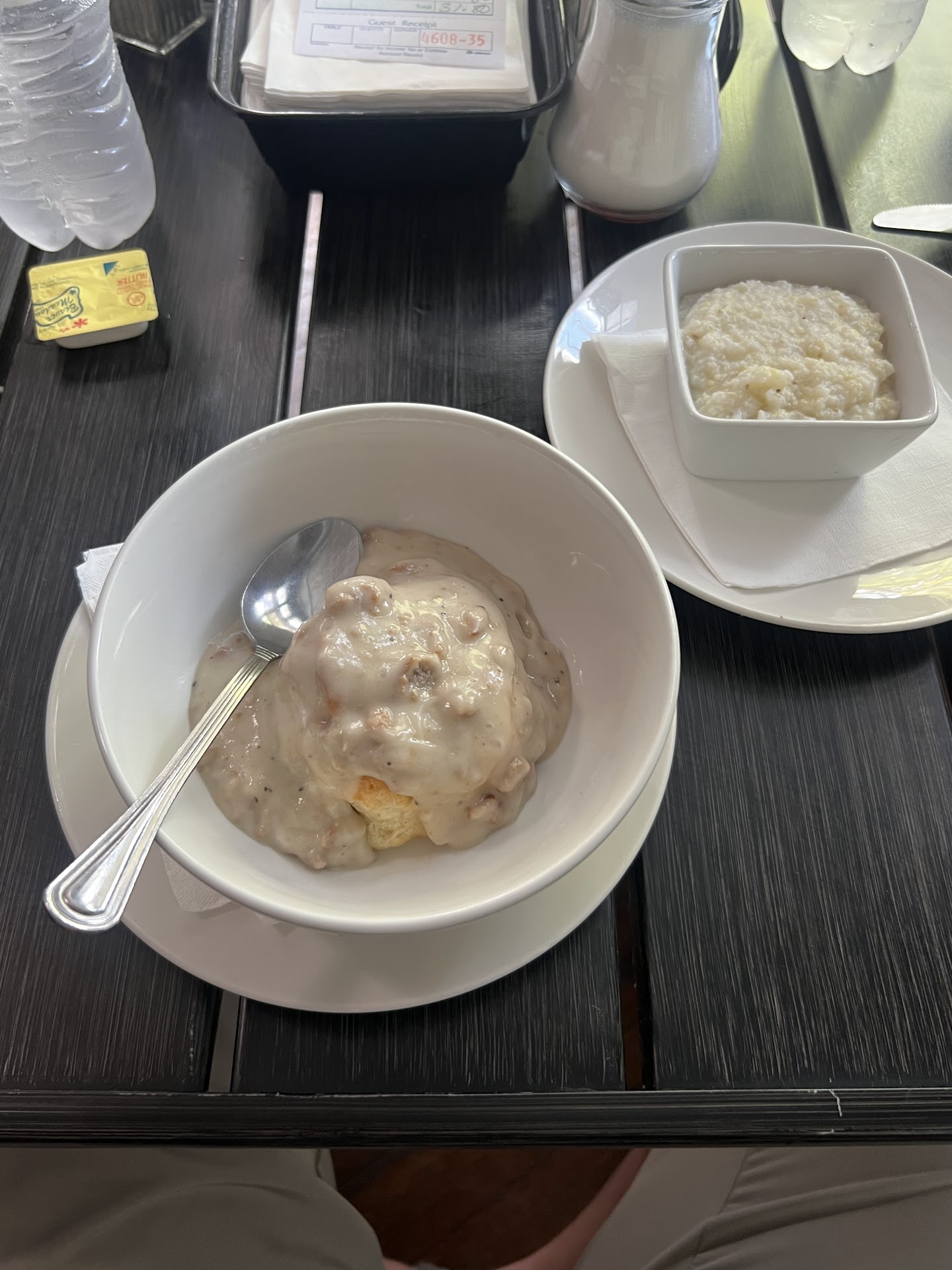 We were out for a drive in the area and decided to give this place a try. We walked in around 10:10 AM on a Sunday morning. We seated ourselves right away and there were a couple of other open tables. So it wasn’t really busy. This place is cash only and there’s no air conditioning. It was pretty sweltering inside and the ceiling fans weren’t cutting it. My wife got cheesy scrambled eggs with bacon and toast, my stepdaughter got a breakfast sandwich and I got one biscuit with sausage gravy and a small side of grits. The total bill was $31. My wife’s scrambled eggs looked decent but she said they were kind of slimy and gross because of the Kraft single melted into it. My biscuit and gravy was good but $7 was a little steep for a tiny biscuit and some gravy. My stepdaughter said her breakfast sandwich was just ok. We waited about 20 minutes for our food from the time we ordered...