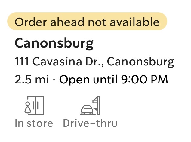 Read moreProbably one of the worst Starbucks I've been too in the Pittsburgh area. We went on a Saturday around 3pm and we ordered inside. Nothing bad to say about service, in fact they were all very kind and professional but the waiting was the longest I've ever experienced. Sure the drive thru was busy but I've been to busier ones and we didn't have to wait 15 minutes for a nitro coffee and cappuccino and a Danish. The place seemed neglected and not inviting at all, as if the tables and chairs were an afterthought. The food was displayed packed in clear plastic bags and the Danish was soggy. If you are looking for a drive thru I'd say it's ok but expect a wait. If you want to enjoy your coffee sitting inside or maybe work there I'd choose another location because this one is kind...