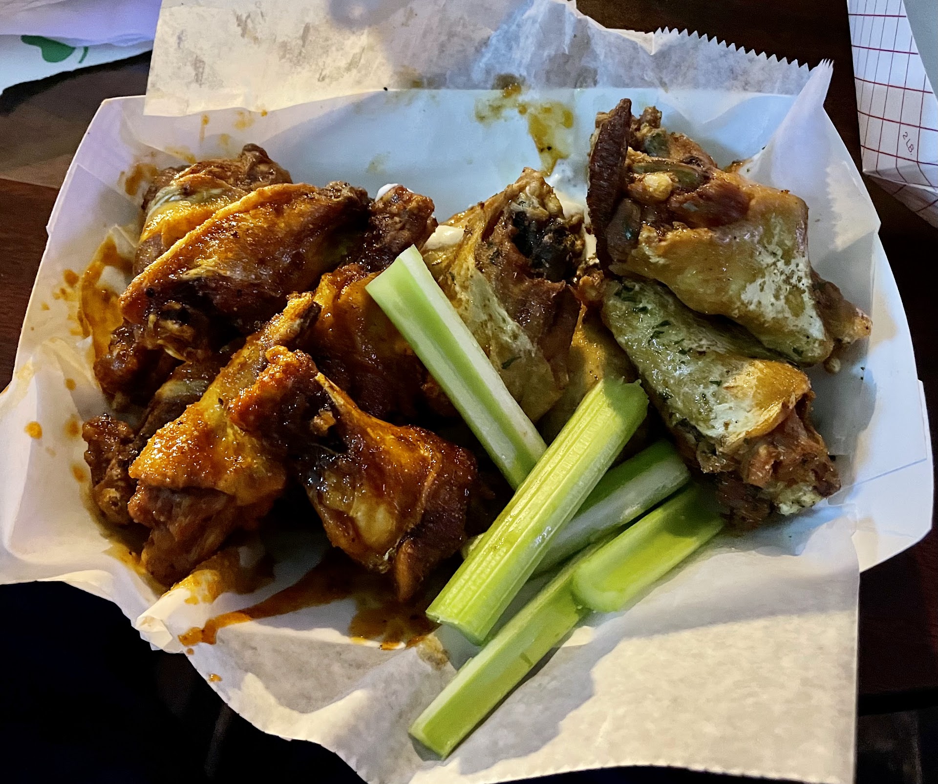 The place is "unprepossessing" to say the least. It's dated and looks like what it is - a dive bar. Not much in the way of beer selection and a menu limited to burgers, fries, and sandwiches. We came for the wings though, and they offer more than a dozen sauces in both wet and dry types and various heat levels. So, we tried eight different ones amongst the four of us. One of us got the chicken tenders as we did not all want to deal with the bones. The waitress told us that for tenders, you only get about four, so we ordered two portions. Oops! What we got was enough for four people!
