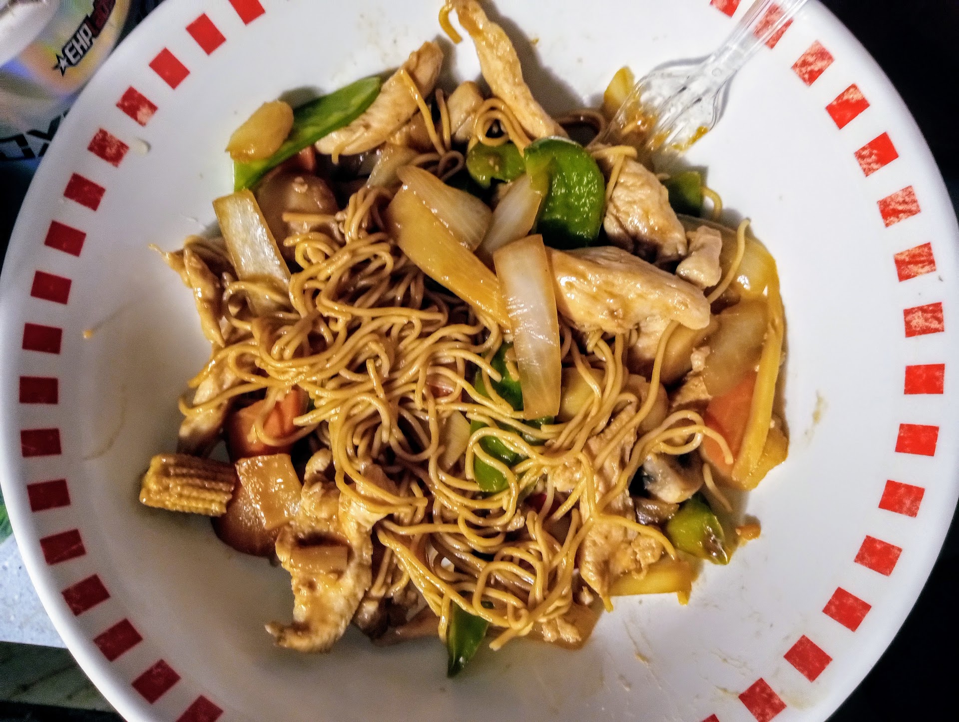 My husband got lo mein. It was the Asian noodles with an unidentifiable meat on the top and veggies that you usually don't find in lo mein. The sauce was not the usual brown sauce but a clear slime. My husband couldn't get past bite 2.