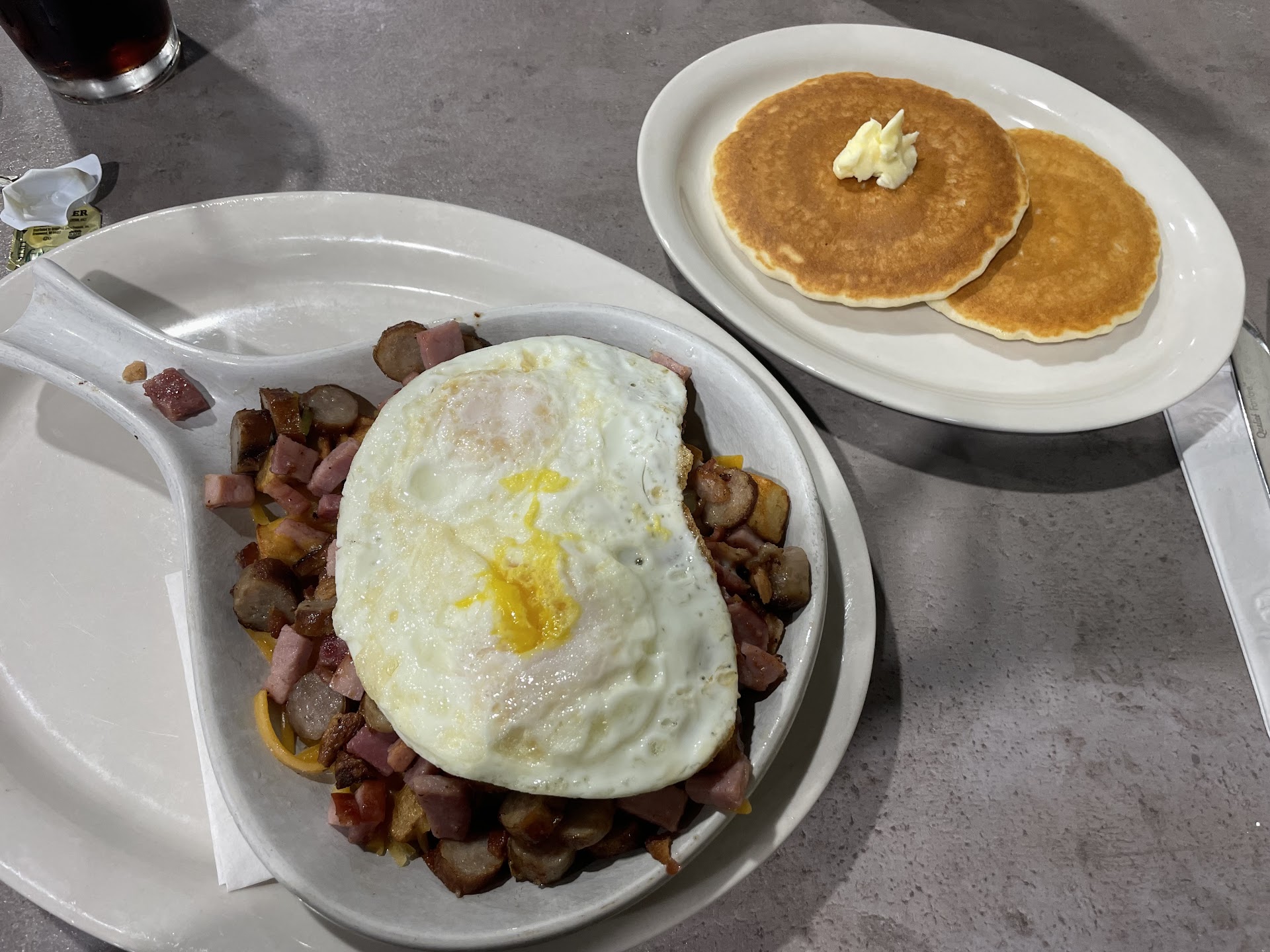 Update: I went back! And boy am I glad I did! I got the triple meat skillet with an over medium egg and a side order of pancakes and man oh man that is my go to now. Savory and sweet and so good! Been back a few times and that’s what I get. Sometimes you just gotta find the right thing to order. My kids like the Mickey Mouse pancakes with chocolate chips and my other kid got the cheeseburger and fries and both said they were delicious!