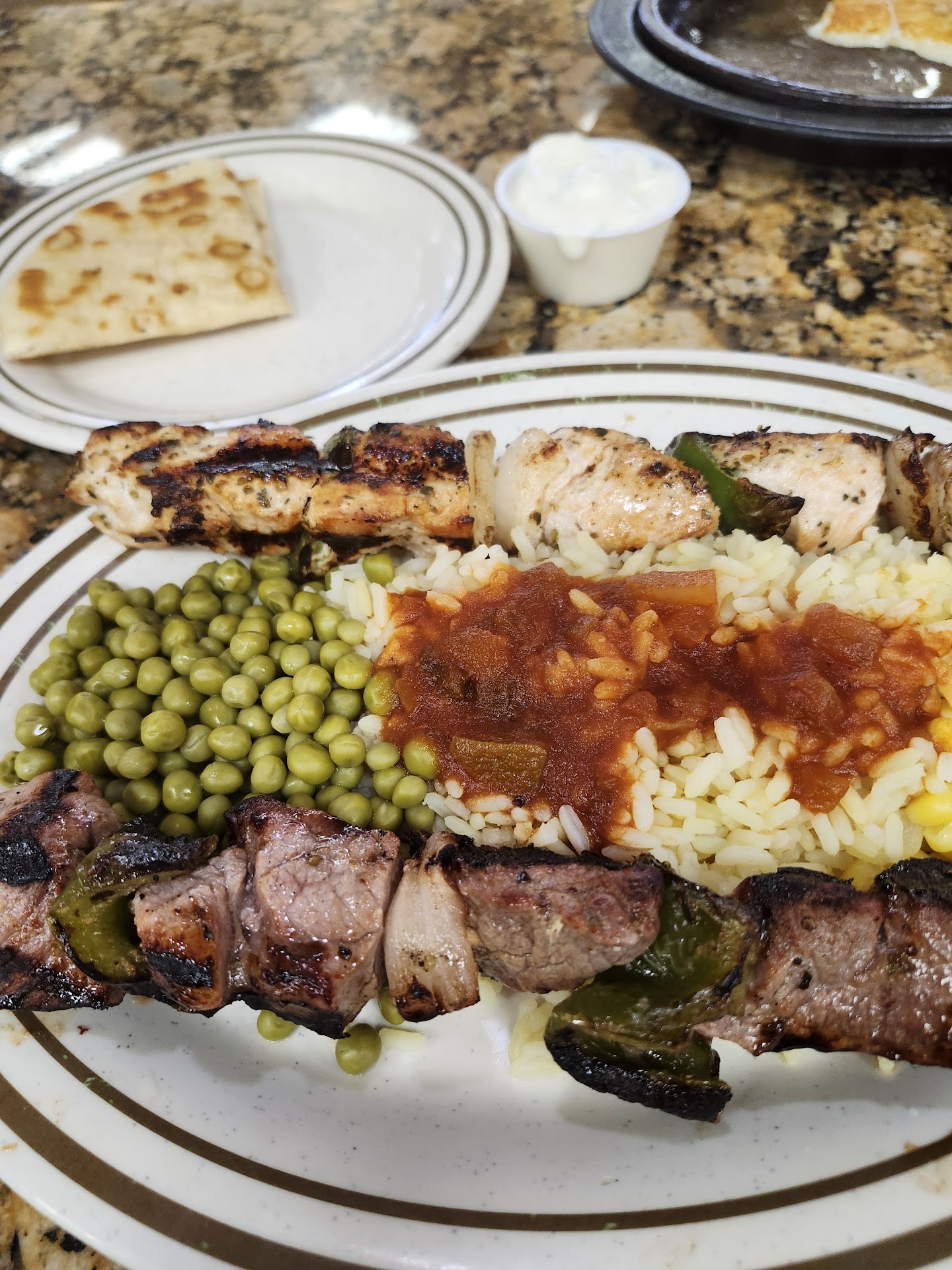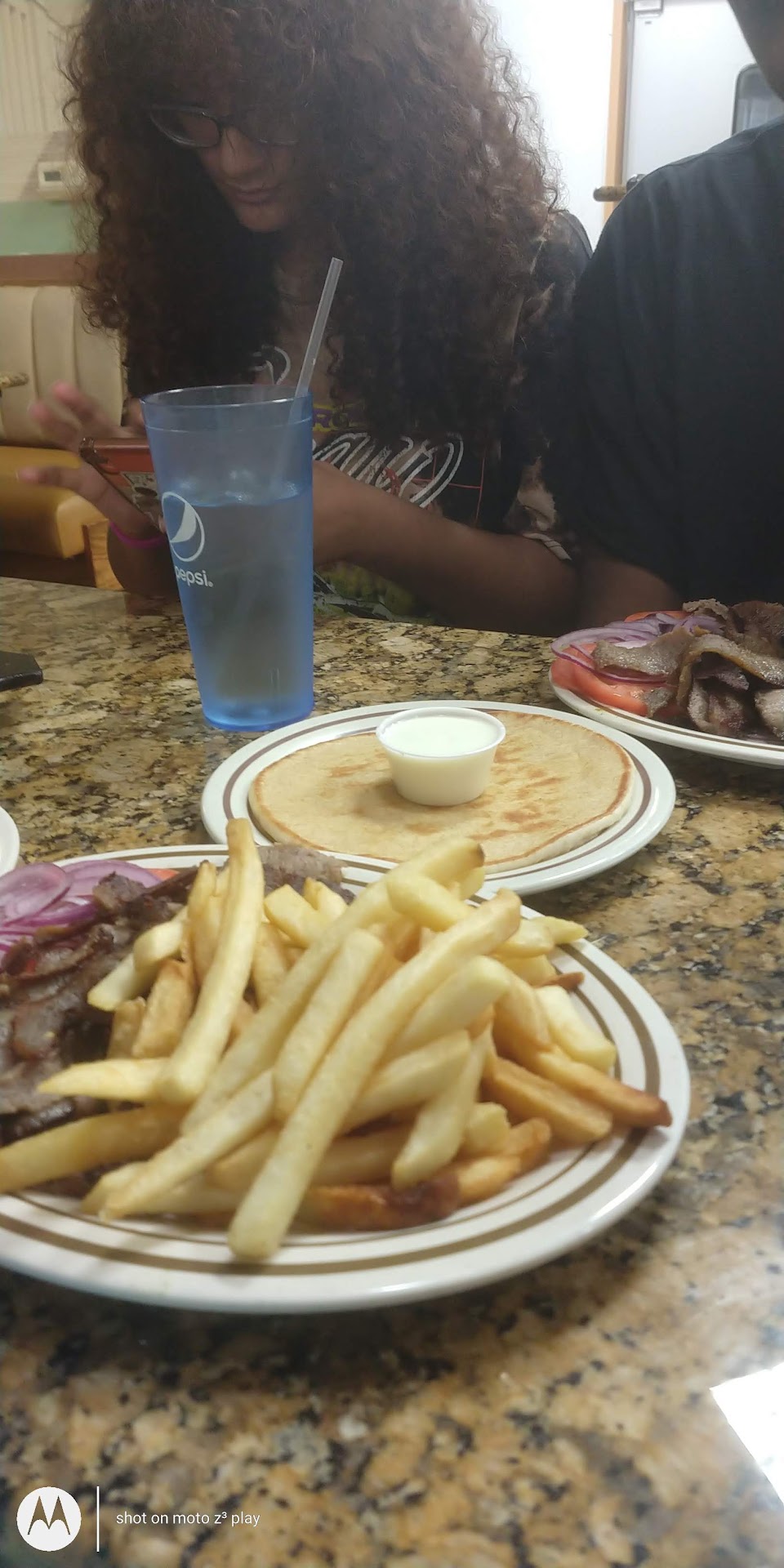 Onto the food. Ordered the chicken strips pita. And the steak and cheese quesadilla with a bowl of chicken and dumpling soup.
