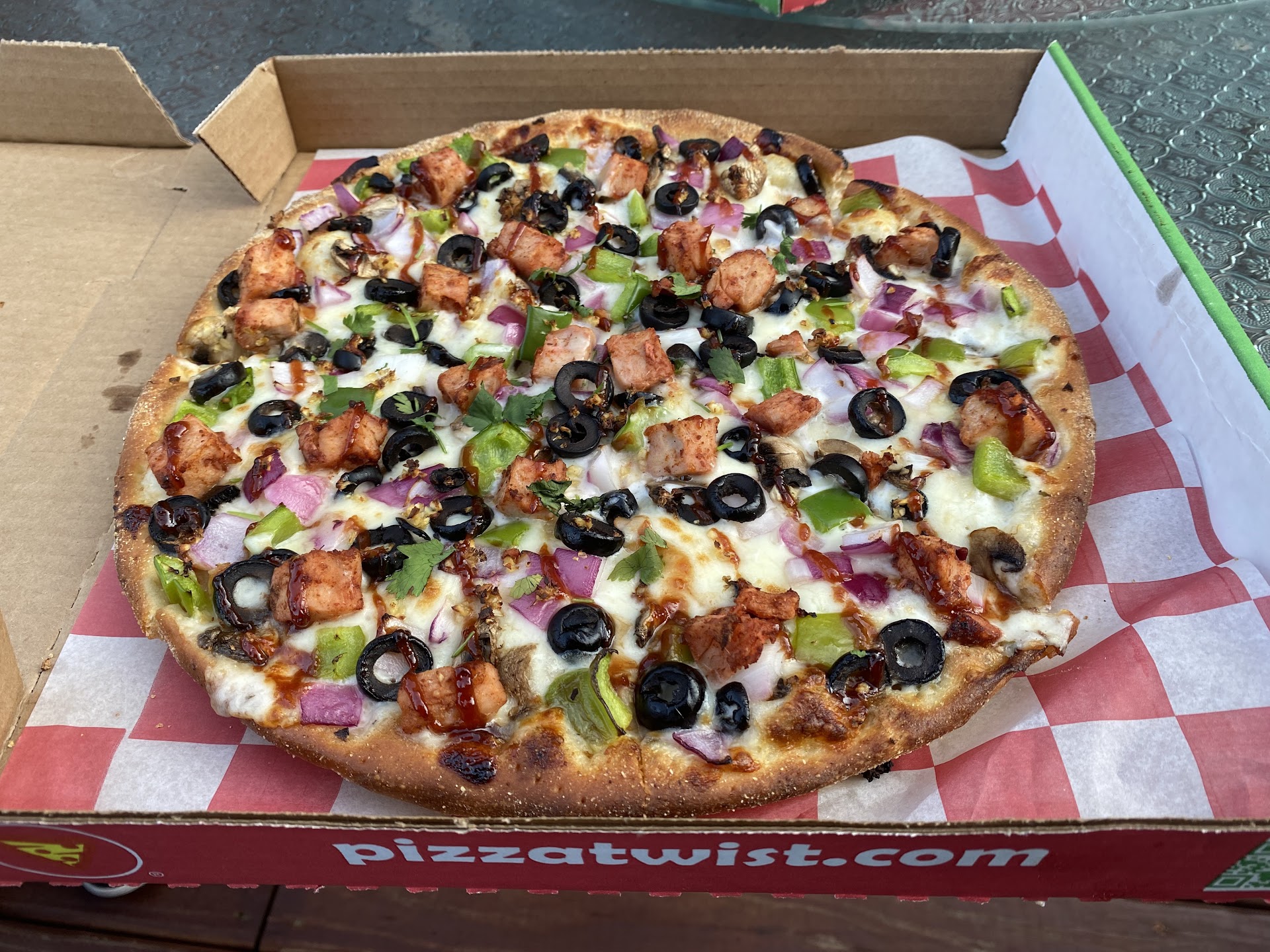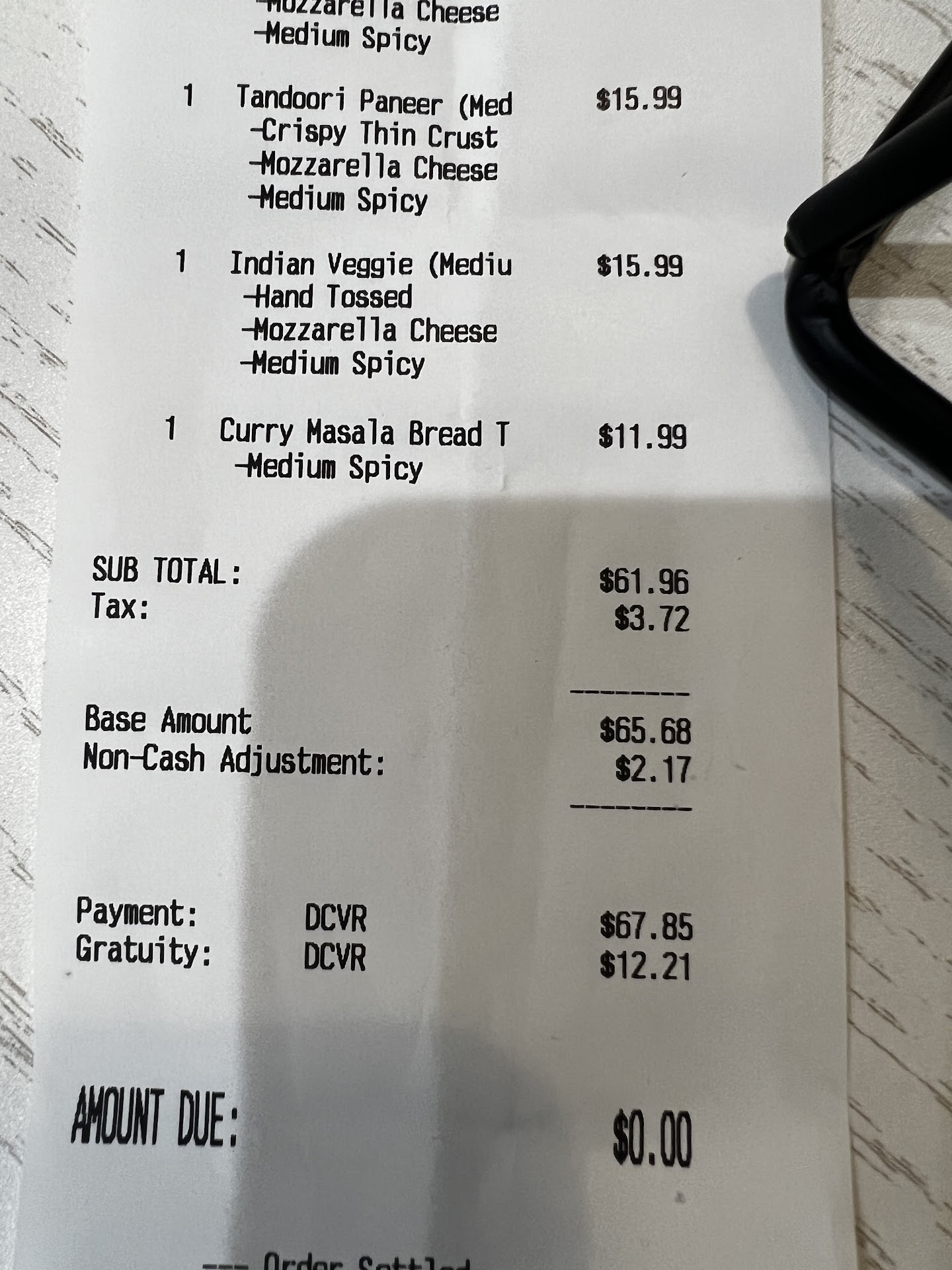 Positives: I love that they have vegan options, and the Indian flavors are very unique compared to typical pizza shops They're usually generous with the toppings One time, they were sold out of a certain item that I ordered online and they gave me an extra pizza to make up for it (it was a higher value than the item that I had ordered, so a good deal for me)