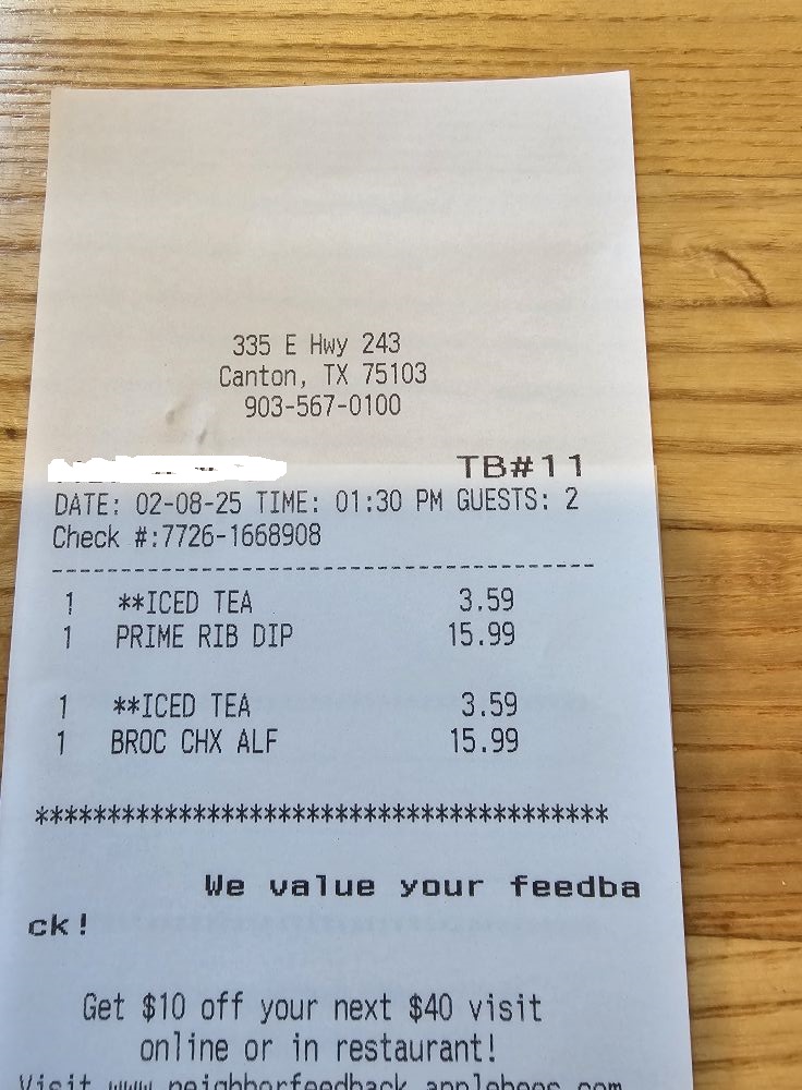 Read moreI have waited to do my review because I really wanted to be able to leave a fair review. We have ate at Applebee's 4 times in the past 3yrs, and got items to go 2 times and last Saturday will be our last time ever eating at this place. Sat down at 12:15 and ordered Prime Rib Dip sandwich and it was way over cooked but edible, and we had BROCCOLI & CHICKEN ALFREDO and they brought out my order at 1:00 yes it was busy however no excuse waiting 45 min for my meal, when I got the BROCCOLI & chicken dish, there was NO BROCCOLI, so I asked waitress why no broccoli she stated "OH SORRY WE RAN OUT OF BROCCOLI and she walked off..I am sorry but as soon as it changed from broccoli and chicken alfredo to chicken only alfredo the cook/waitress should have came out and told us before cooking the meal without all ingredients. We are locals we eat out several times a week and have for years but this place is the worst place in Canton, Tx to eat at or to get items to go. Every time we have ate here a major problem occurred and it is no longer worth our money or time to eat here, we were offered no exchange or nothing. We paid the bill and left. DO NOT GO TO THIS PLACE EVER SAVE YOUR MONEY I removed waitress name on ticket if because this is managements...