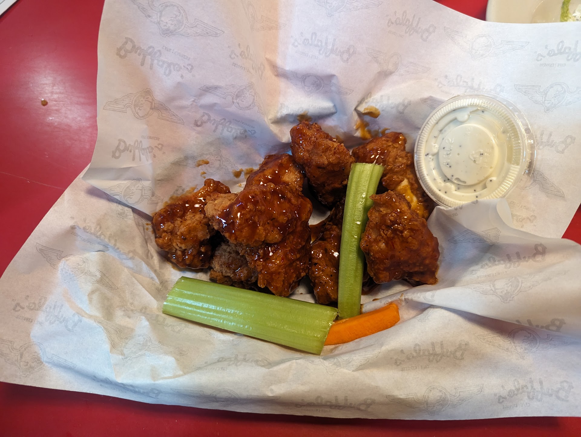 Read moreIt's been over five years since we stopped in. We went about 30 minutes after they opened for a quick lunch. Our waitress greeted us with a smile, and was super kind. We ordered southwest egg rolls for an app. We forgot to snap a picture, but they are served with a chipotle ranch. They were very flavorful. Highly recommend. We also ordered 8 boneless wings with the Korean BBQ flavor. I'm always very hesitant about boneless wings and always worried about biting into a bad piece, but these did not disappoint. Breaded lightly and great quality chicken. We got their house made blue cheese on the side which was tasty. Also ordered the Apache chicken wrap which comes grilled, but I swapped mine for fried and tossed in their scorchinâ sauce. I love spice, so this was the second hottest one they had. Great flavor and great heat. On the wrap was the chicken, pepper jack cheese, lettuce, tomato and chipotle ranch on the side. Great size wrap. Subbed out the chips for curly fries. Lastly, was the kids hotdog and fries. We enjoyed all of it. Will definitely be...