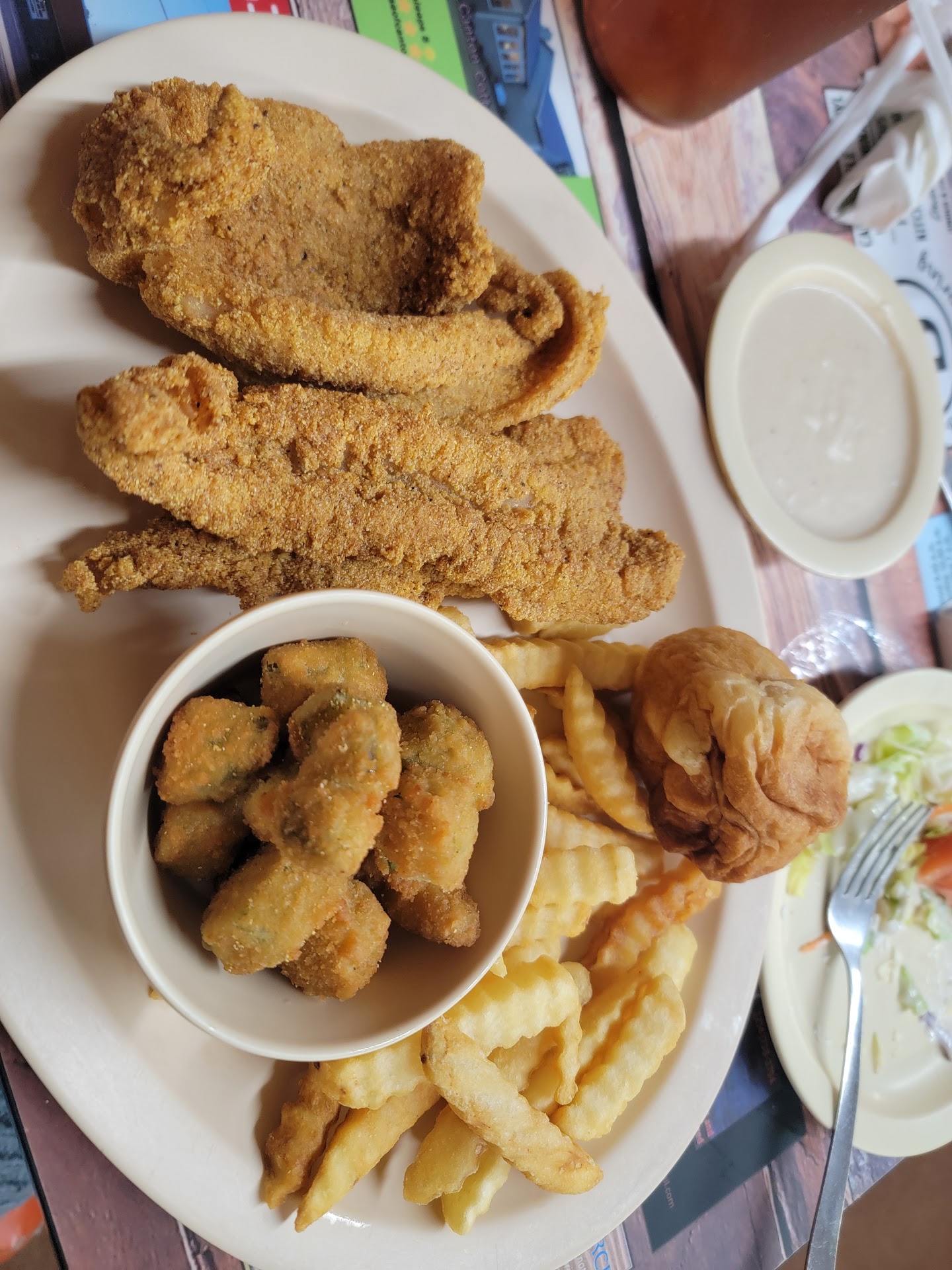 That being said, the food is average and tastes just like any other "Country Cooking Cafe" out in the state of Texas. I had the Chicken Fried Chicken, Mashed Potatoes and Gravy, and Fries and it was all pretty bland and without a whole lot of flavor. I had to put a ton of salt and pepper on my potatoes just to taste something other than what I can best describe as moist mush. I ordered fries, and they came with onions minced on them which was incredibly odd as I was just expecting regular French fries. The corn bread was decent and the chicken wasn't dry, but again it didn't have much flavor. Our server was incredibly friendly and attentive on the bright side, and kept up with our...