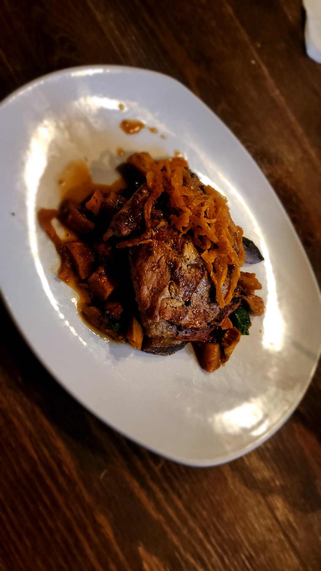 We had the BangBang Shrimp, which was quite average as Bonefish, and even WalkOns does it better. My husband ordered the Seared Tuna Steak, and I got the Pork Loin, which was absolutely delicious. It was accompanied by sweet potatoes (slightly too salty), mushrooms, and exactly three leaves of spinach which I found amusing. My husband's tuna was cold to the touch, so he asked for it to be warmed. The waitress, who was a bit hit and miss (and possibly contributed to the coldness since new silverware had to be retrieved for him post-appetizer by the busboy as we couldn't find her) came back and said the chef said that's how it's supposed to be because its raw on the inside. My husband countered that yes it is, but it's supposed to be seared and thus warm on the outside, but that was apparently to no avail, because she just asked him if he wanted to order something else without presenting him with a menu. He then just ordered the grouper, which arrived once I was nearly done eating and had so little seasoning that he was looking for table salt, but alas, there was none to be found along with our waitress. The accompanying sauce only provided mild relief. We thought we could end it all on a sweet note by ordering what seemed to be a unique dessert, chocolate creme brulee, only to be told that they had just run out of it, at 7:30, on Valentine's Day. At least they offered us the regular creme brulee version and comped it, which was also not warm. Perhaps the food just cools down, traveling to the drafty downstairs area. We then had to wait quite a while for her to grab our card so we could pay and leave, a definite pet peeve of mine. I know they were busy that night, so the service being off could just be an anomaly, but the food issues and atmosphere will cause us not to return. We will just stick with the one on...