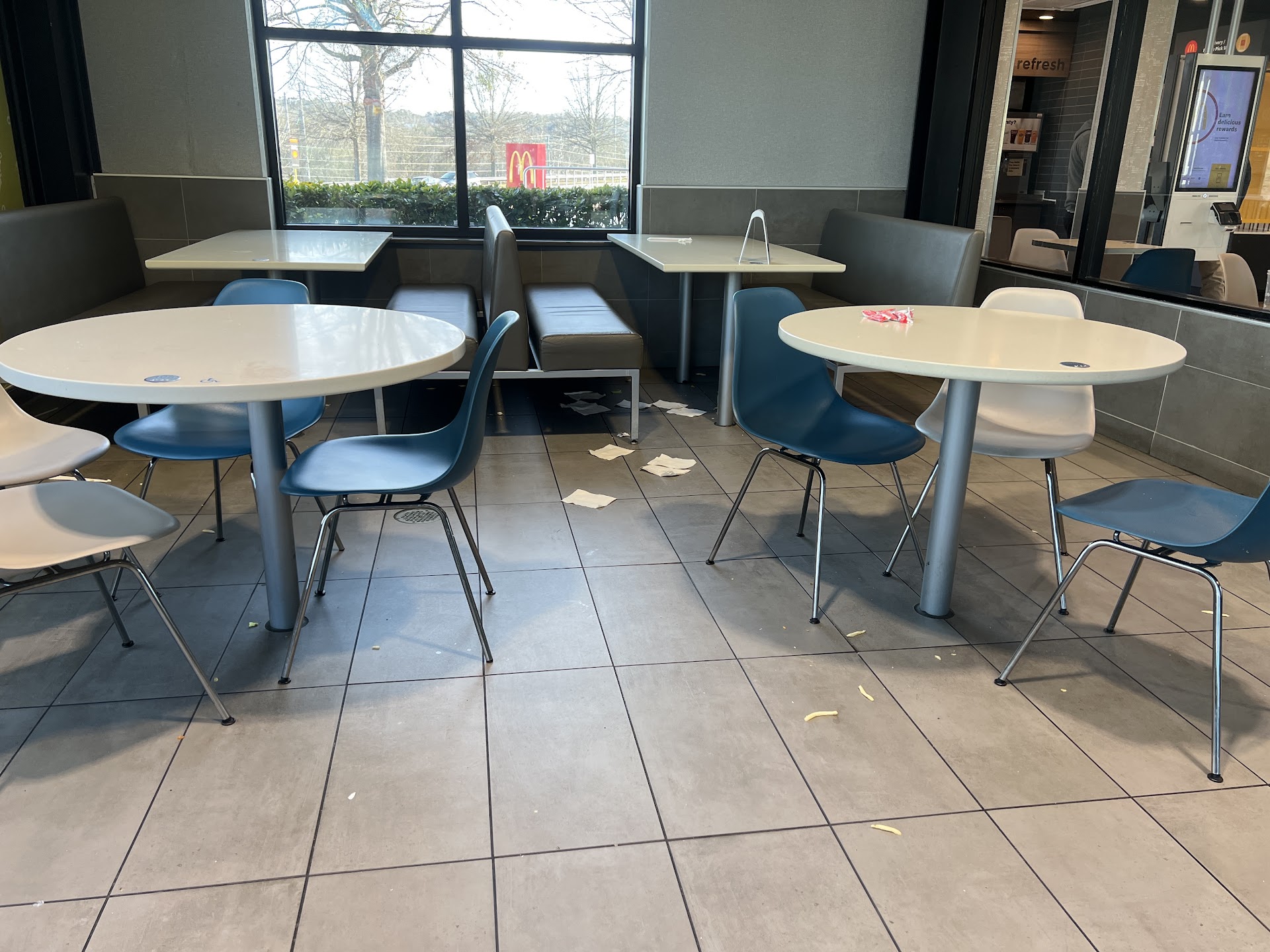 Edit (since this McDonald's clearly wasn't done with this amazing experience): we were eating in the play area and the janitor comes around mopping the floor and starts mopping under the tables. He gets to our table and I'm like surely this dude isn't gonna do it...spoiler alert: he totally does... HE HAD US MOVE OUR FEET WHILE WE WERE EATING TO MOP UNDER OUR TABLE. WHILE. WE. WERE. EATING!...I can't get out of this place...