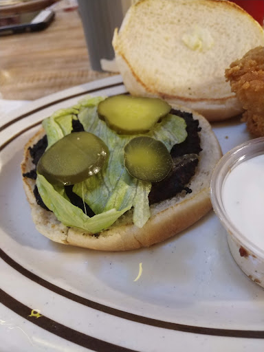 Read moreI love the set up of this place, the interior deco and comfy retro feel....And the employees are very friendly . But a few things fall short of 5 stars.... I went into the back room, that they don't use very much. I think it's saved for party rentals...A few places in the restaurant you can see that they had some roofing problems...Stains from leaks on the walls in a couple of places...One of those I saw in this room. But if I was the manager, I would have cleaned the drywall that turned liquid during the roof leak and dripped down on one of the metal hanging light fixtures, then re-solidified! I wonder how long that has been there!? Ive cleaned alot worse during many of my days! Yeah, I imagine you can't get a young person to get up the courage to do a job like that...But thats what an OWNER TAKES ON to keep his place ON TOP! Also 9.95 for a qt of carry out ice cream? take-out candy of some sort that my friend broke down and bought for $14/lb?....2 pcs of deep fried fish and lotsa shoe-string fries for 11 something? I'm just not used to prices like those....The inflation this federal administration has cultivated is out of control and has ruined every ones understanding of the value of a dollar and what jobs pay well and which ones don't. We are right on...