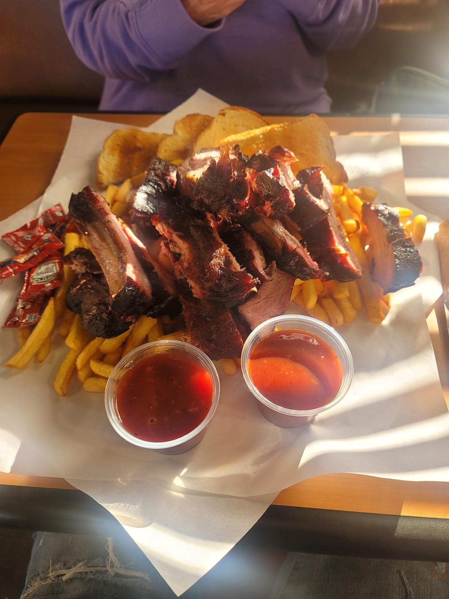 Read moreI ordered the sliced brisket plate, it cost $22. There were 3 other tables occupied when I ordered, I waited over 30 minutes for the food to arrive. The brisket was cold to the touch, very small portion maybe 1/8 lb or less. The brisket was sliced paper thin. Very very tiny smoke ring on one side so it was obviously cooked mostly in an oven. Maybe a couple hours of smoke for a little flavor. I couldn’t identify the slight wood taste but definitely wasn’t oak or hickory. Zero fat so it must’ve been trimmed off prior to cooking. The meat wasn’t cooked until tender but the 1/10 inch thick slices made that irrelevant. The potato salad was ok, the fries were very good. I’ll never stop here again obviously but the workers were nice to me and the...
