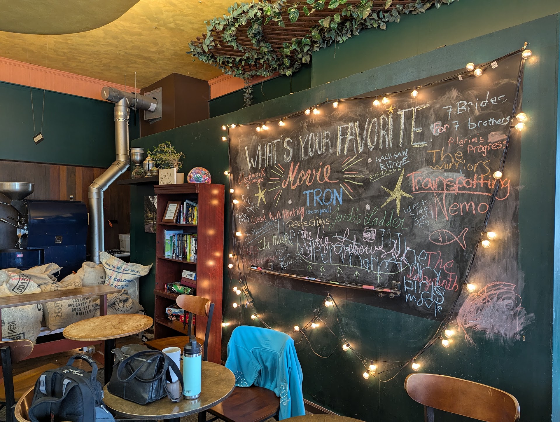 My favorite part about it is just the aesthetic. It's an old building and they took full advantage of that to build a very rustic, yet homey feel. Light music plays while the smell of coffee and fresh baked bakery items fill the air. Has huge windows overlooking the road and they light the building with a calming dim light. It's really something special.