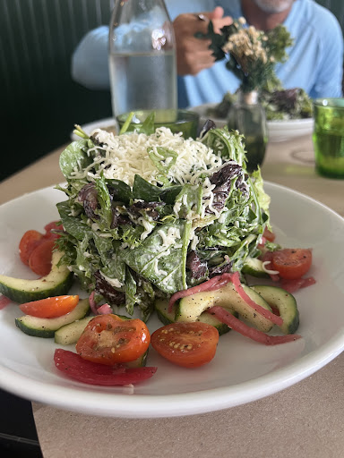 The side salad arrived. The dressing was supposedly already added, because the greens were wet looking and you couldn't taste any dressing. I had to request a side of dressing.