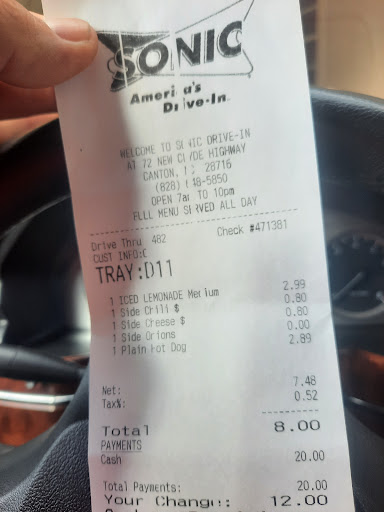 Read moreI hate reporting anything negative about a Canton business, but this has been ongoing and something needs to be said for protection of our citizens. If ANYONE knows the owner, someone needs to inform Decided to make a sweet run to Sonic in Canton. Time on ticket 21:54:22. TKT 297 Ordered moulton lava cake, 2 shakes. Paid for order, 10 minutes later, young man dark hair and Latino woman inform us they don't have lava cake. Offered to put our name on list to get later. Ummm I don't think so. I have never retrieved the food they owed me from mixed up orders and credits. I could fill my dash up with bad service from here. It was obvious this young man has no clue how to credit my account. The scary part is him telling me he will credit the entire amount and ring up again. Ummm no, last time I allowed this a $1.50 charge became $150.00. Took 2 weeks to get money back. I said void the entire sale. So he did, I was going to leave and he gave me the 2 shakes he has quickly made. ??? I wish I hadn't taken them now. I split mine and past the whipped cream, the shake poured like water. FACE PALM, WE DRANK IT ANYWAY! We've been sick all night. SONIC you've finally blown it with me and my neighbors....OFF OUR LIST!...