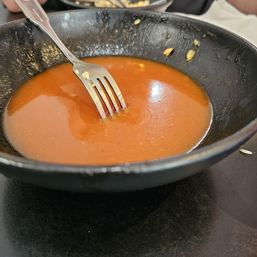 My fiance ordered mango chicken stir-fry. It comes in a bowl because it's very soupy. You could taste mango.... medium hot... umm yeah maybe a little spice. Definitely not a level 3 out of 5. My fiance described the base flavor as tomato soup with mango. He sub fried rice for the white. The rice wasn't worth the extra $3... it was like brown rice with egg. He ate all of it because he was starving.
