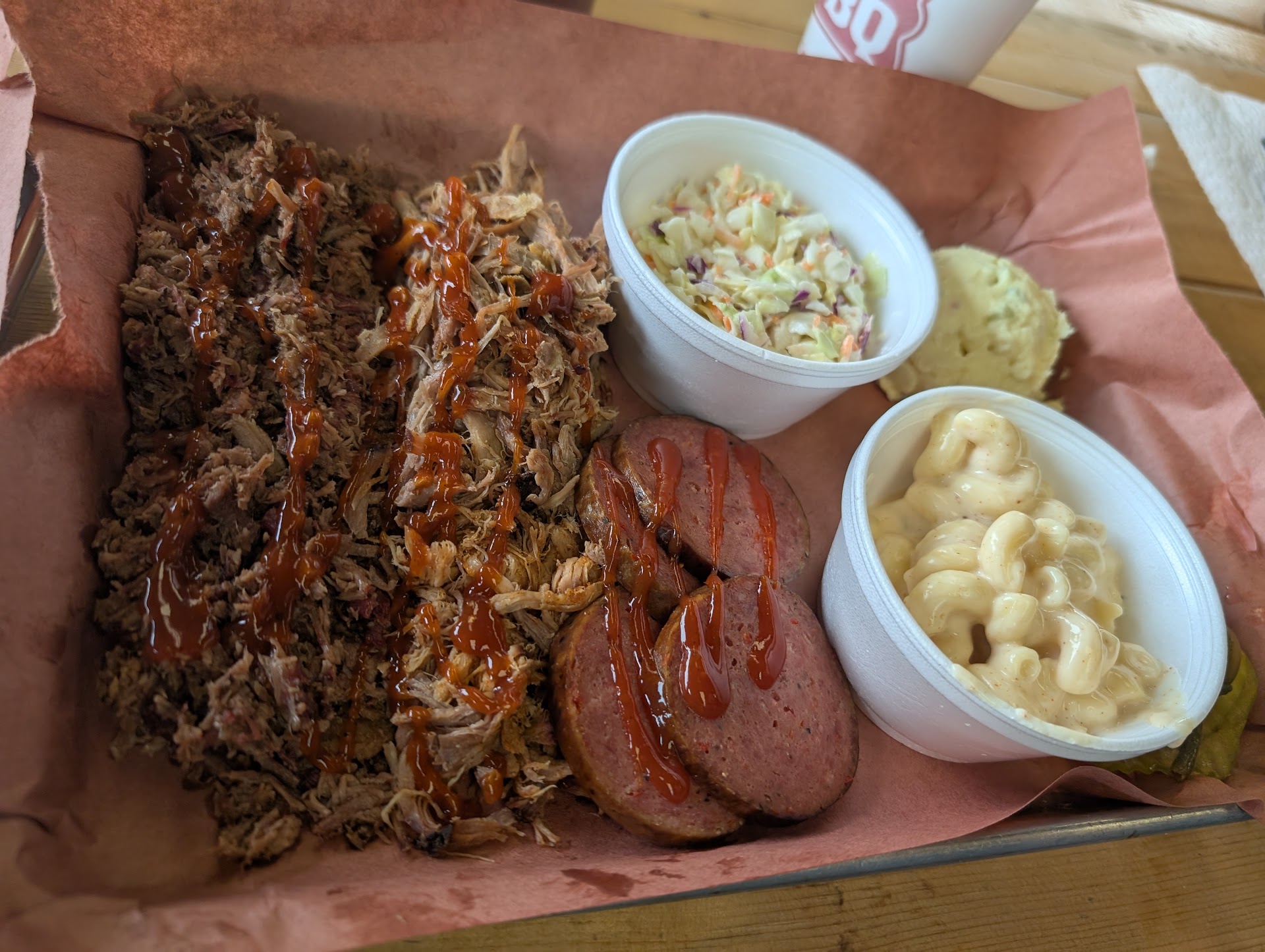 Read moreDriving through Texas decided to try some BBQ. This is more of a take out place as the atmosphere is more like a fast food location. The bbq was pretty good, although the 1 rib I got as my 3rd side (3 meats w/3 sides $22) was only ok, but I’m not a rib knowledgeable person. The beans were disappointing..a bit bland in a very liquid sauce. The Mac and cheese was great - had a little kick to it - and the...