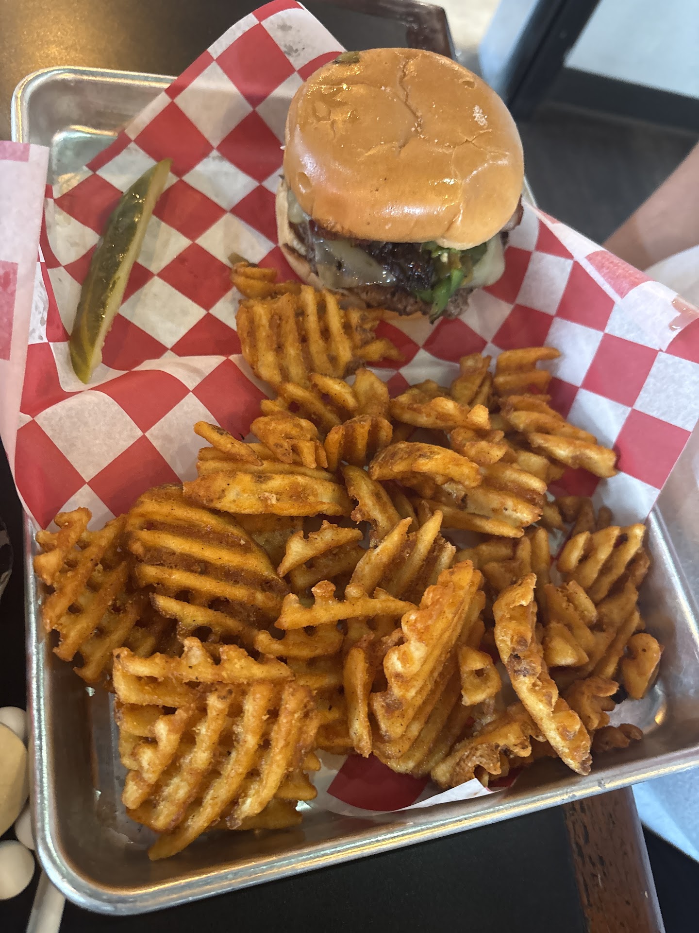 Read moreOrdered food from here for the first time tonight over the phone. Upon arrival to pick up our dinner, the staff was friendly and prompt. Ordered the jalapeños popper burger and the west Texas burger and neither of them disappointed, they were delicious! I thought to myself that the price for a burger seemed crazy. However, upon opening my box of food, the portions certainly made for a good deal in my opinion. I would eat here again and...