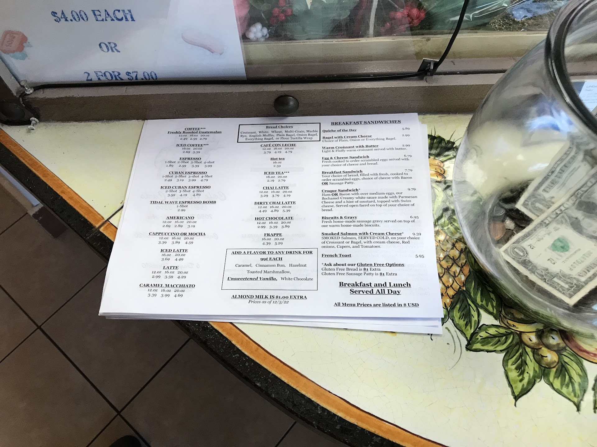 Read moreA good breakfast location north of Ron Jons I was driving by headed to the port when I saw this place on the east side of A1A. It is in one of the many strip centers as you travel north on this road. This restaurant has only a few parking spots directly in front of it but it shares the lot with other businesses and there are more spaces in front of the other stores. As you enter, the counter is directly in front of you. They have totally enclosed the counter so you order through a window. The menu was a simple trifold paper affair. They have lots of coffee and tea choices and several breakfast options. The prices are very reasonable with everything from a $3 bagel to $10 for a smoked salmon sandwich. I ordered bacon, egg, and cheese on a croissant. The food came out quickly and it was absolutely delicious. Inside seating is about 6 4-person tables along the left wall. I believe that there might be more tables out the back door but I did not check on that. The decor is space-themed (appropriate for their location near the south end of Cape Canaveral). The store was very clean and the staff was very pleasant and nice. It was a very nice place. I plan to visit again and recommend it to my...