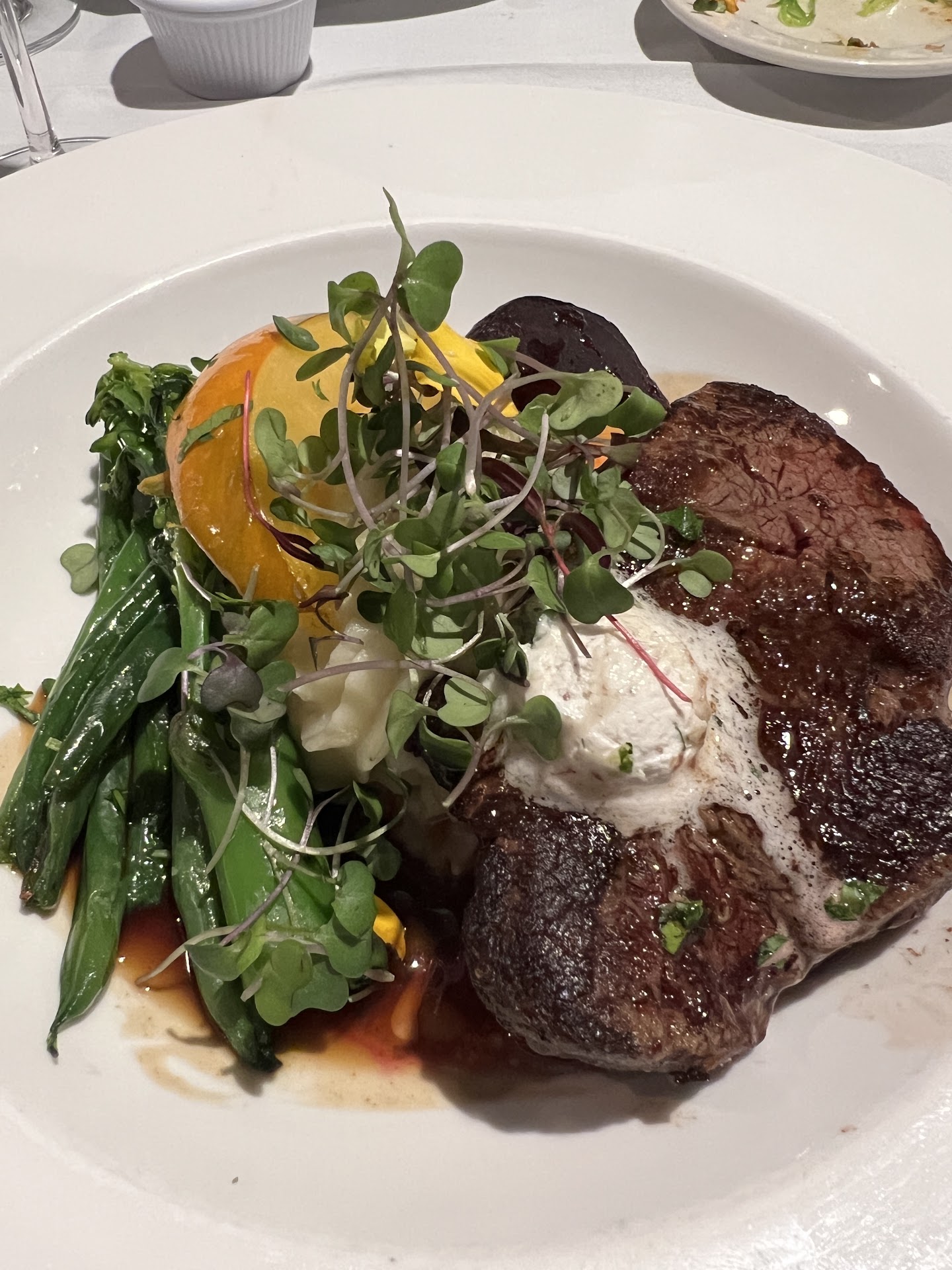 The last time we came was on Valentine's Day which is, of course, a busy and challenging day for all restaurants. We were seated promptly and enjoyed the wonderful martinis with their lovely little slick of ice on top. We both ordered the Artichoke Bottom for our first course, and it was scrumptious.The bread seems to have changed though, unfortunately, and was some sort of overly dense, pretty flavorless pretzel bun like thing.