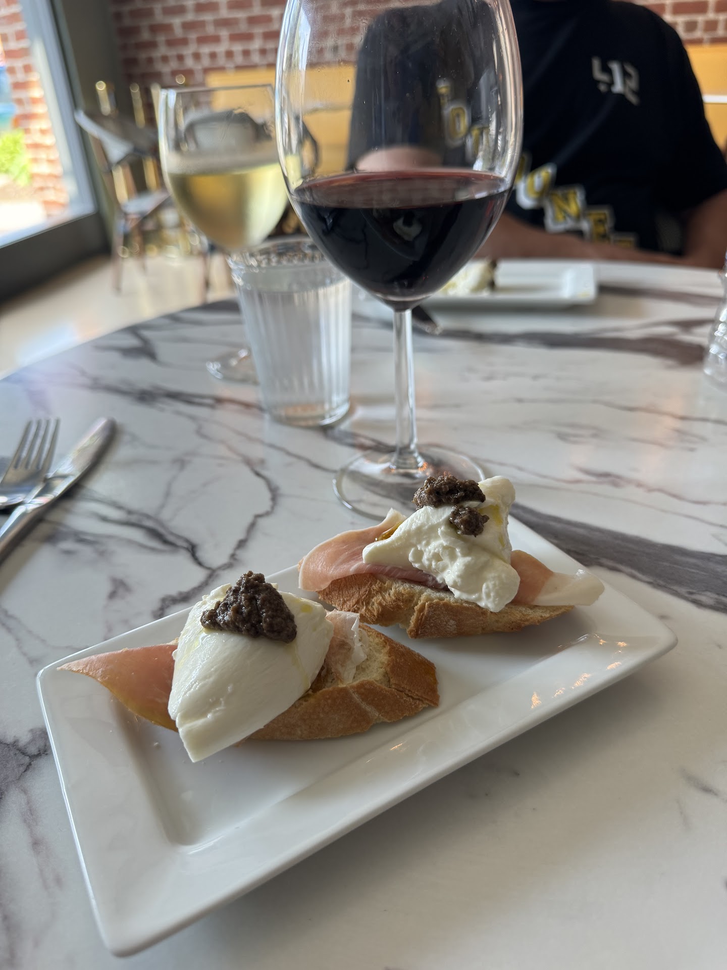 The food was decent. It wasn't horrible but not a single dish we tried was excellent. We started with mussels (very little flavor in the broth, very small amount of broth, and many gritty mussels). We also had bread with burrata which was mediocre. We joked that the bread wasn't fresh and must have come from Food Lion. I truly can't even remember the third dish we ordered but it wasn't memorable clearly.