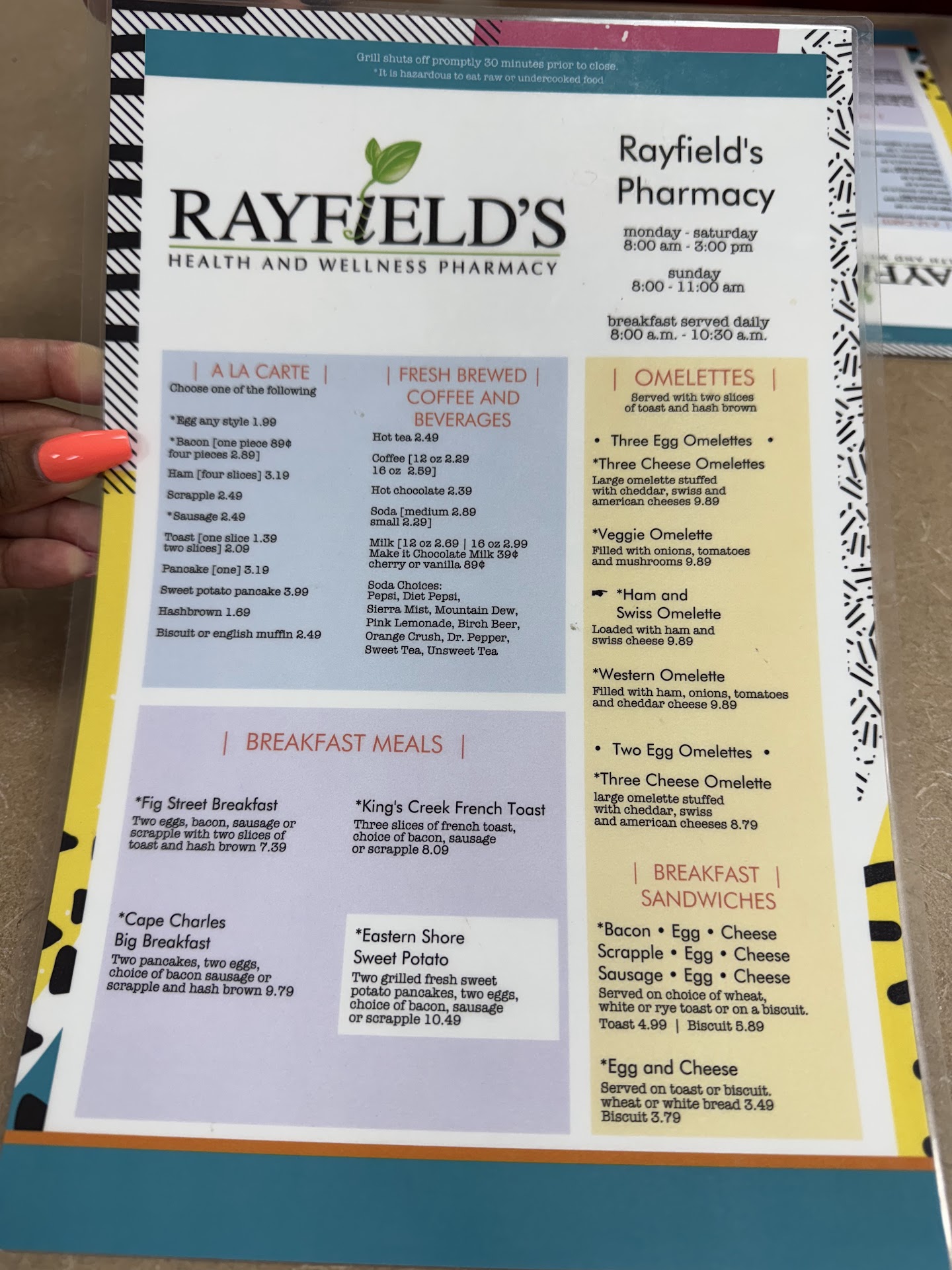 While heading up to Chincoteague Island we stopped in Cape Charles to have breakfast here at Rayfield's. First I want to say that the prices here are very nice. Especially in today's world. Now for the food... I got the veggie omelette meal. It came with a 3 egg omelette onions mushrooms and tomatoes rye toast and a hash brown, and scrapple. Yes I said scrapple! The family got French toast with sausage and the little guy got a pancake with bacon. The pancake was HUGE! It was the size of the plate and had nice crispy edges. For me it didn't even need syrup. The French Toast looked good. The batter looked like it had cinnamon in it and was golden brown. The sausage was a bit different though coarse grind and split and grilled. It didn't taste like typical breakfast sausage. My meal was very good but the way that the scrapple was cooked threw me off at first. I've only had scrapple pan fried. But this was deep fried so it was a bit greasy. It tasted good though. And the hash brown had a little pool of grease on the plate where it was placed. If you are in the Cape Charles area and are looking for a bite to eat give this place a try. They are open for breakfast...