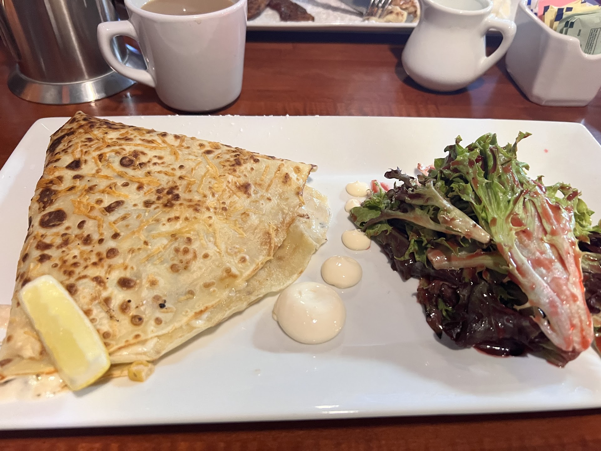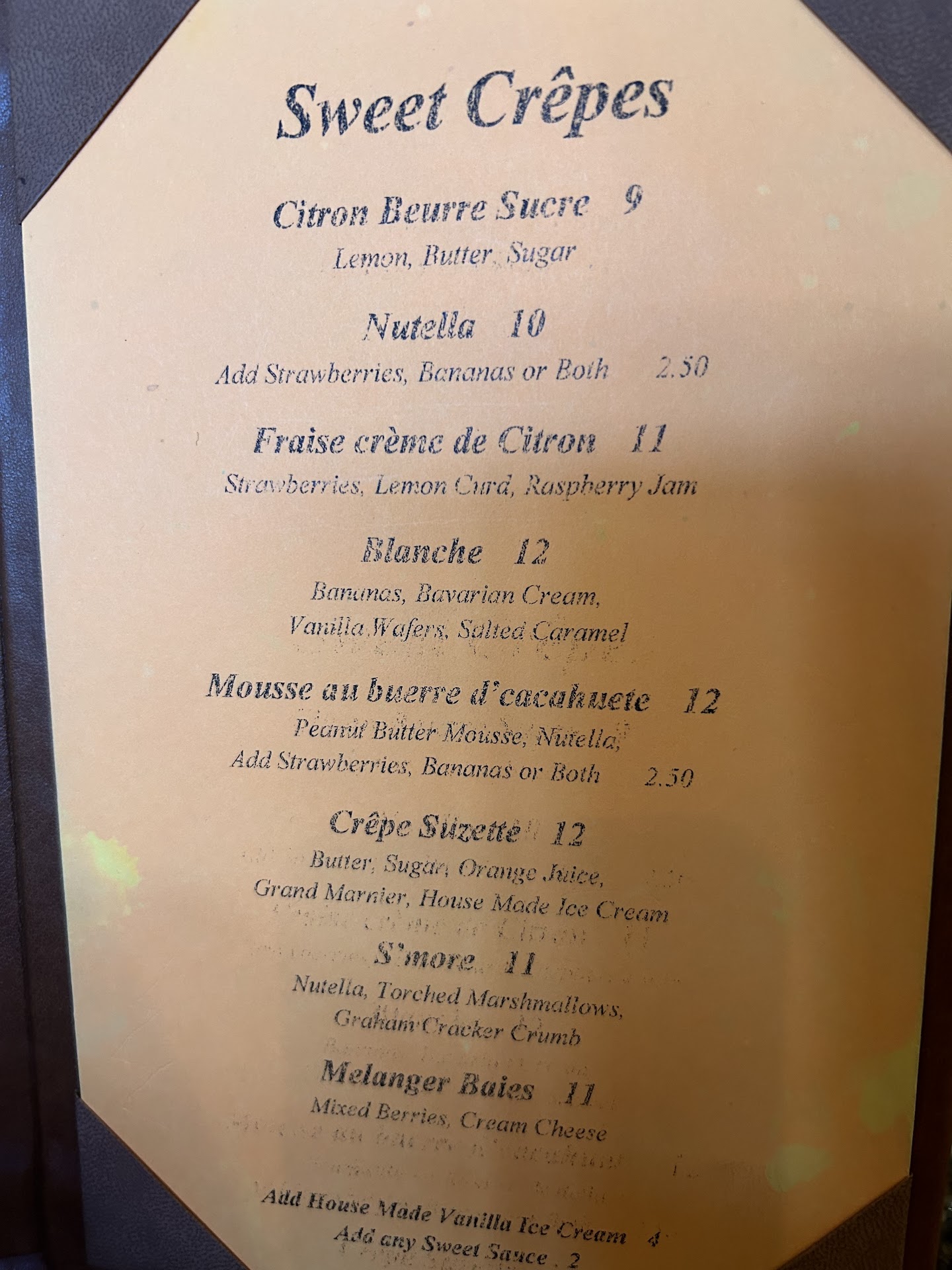 Now, let's talk about the food. I can only speak about the items we received, but our meals were excellent. I ordered a shrimp and crab Crepe (Parmesan incrustee Fruit de mer), and my granddaughter ordered a Nutella with banana and strawberry crepe. What surprised me was how beautiful the presentation was. The Crepe was served on a rectangular plate. For my Crab/Shrimp crepe, there was the Crepe, beautiful dollops of sauce (arranging from small to larger dollops as it went around the Crepe and a side salad with a delicious raspberry vinaigrette. My granddaughters were also served on a rectangular plate with the Crepe on one side and a bit of fresh whipped cream with Banana, Strawberry, and Caramel on top. The Crepe was dusted with powdered sugar, and there were two slices of thick-cut sweet bacon in the shape of an X on the other side of the plate. Wow, I was blown away and didn't expect this at all. We could have each brought half of the meal home but finished it there because it was so good.