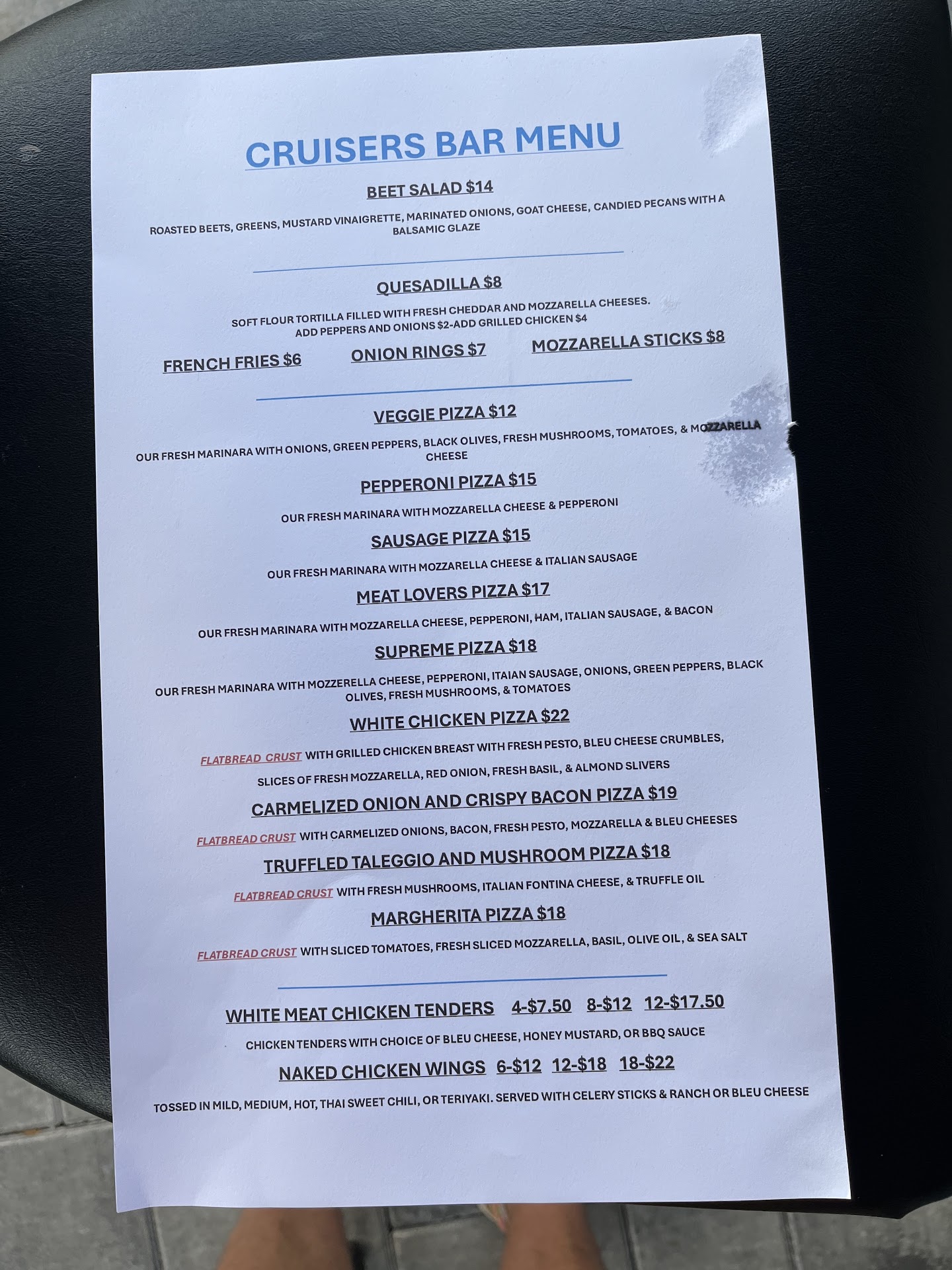 Read moreI only waited the food 5 stars because I knew it was going to be amazing if I did order something the service was only four because I'm homeless and I wasn't able to fully take advantage of the full capabilities of the absolutely wonderful aesthetic that Cruisers brings to the table, I rated the atmosphere one star because one of the owners kicked me out for absolutely no reason I did nothing wrong whatsoever to The Establishment or to any of its people I didn't leave any negative energy and I feel like he actually wanted to ensure the fact that he had as many free cards as he wanted to for his personal sexual fantasies I would have no issue with that only if it didn't come at the cost of my life and my positivity and how I'm trying to spread that with the world. Is knowledge of that fact is at this moment not important to me neither needed for this to be read and understood....