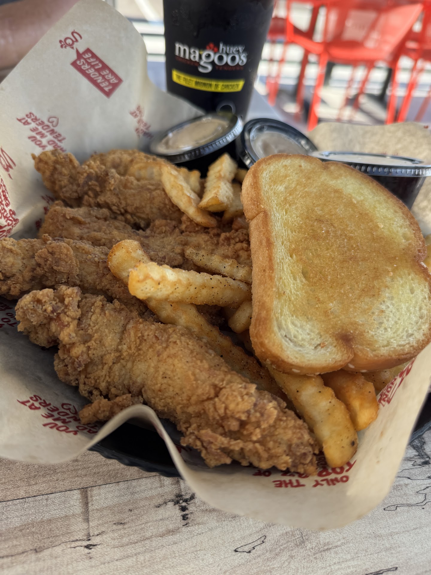 Read moreChicken tenders have been my go to meal since my baby teeth came in. Even in my 40s I still crave a good a chicken tender. So when a friend raved to me and my husband about Huey Magoo’s I knew we had to check it out. It was ok. I will say the coleslaw was really good. My favorite part of the meal actually. Of course the crinkle fries were good who doesn’t love crinkle fries. The sauce they give with the tenders was interesting. Neither good nor bad but it did make the tenders better. Now the tenders. I was disappointed. My first tender was a little tough and stringy but the rest of the tenders were fine. I started with dipping it in the sauce. It was fine as far as flavor but it didn’t wow me. Then I tried it with ketchup. Not good. I tried it without any sauce and that is when I realized the tender itself is pretty flavorless. There is an undertone of pepper that hits you but other than that there wasn’t much flavor. I ate about 3 of the 5 tenders and my husband only ate two of his. As far as fast food for chicken tenders it would not be my first choice. At this time I will not rate the service as they are newly open and that causes an influx of customers that makes wait times extra long and service seem slow. I mean give it a try maybe you...