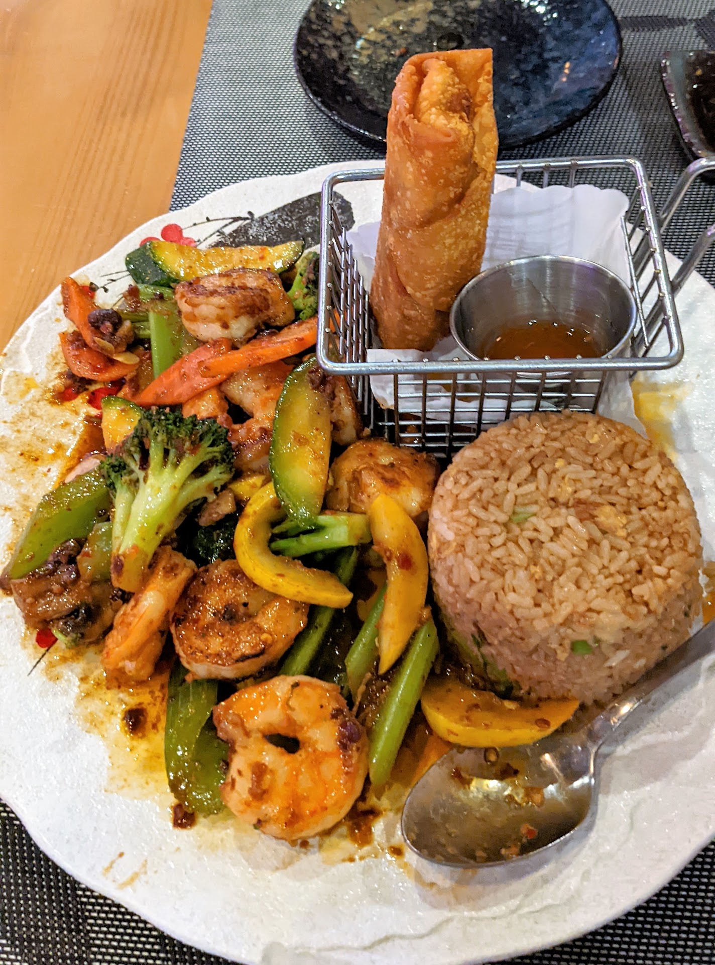 We ordered a build your own plate with shrimp and veggies that come with two sides to split. We opted for an egg roll and fried rice. We really thought the dish was savory and was everything we were hoping it would be. The only change we would have made, would have been to get it a little spicier (yes, it is a theme with us). The portion was great for us to split. It was definitively an excellent dish.