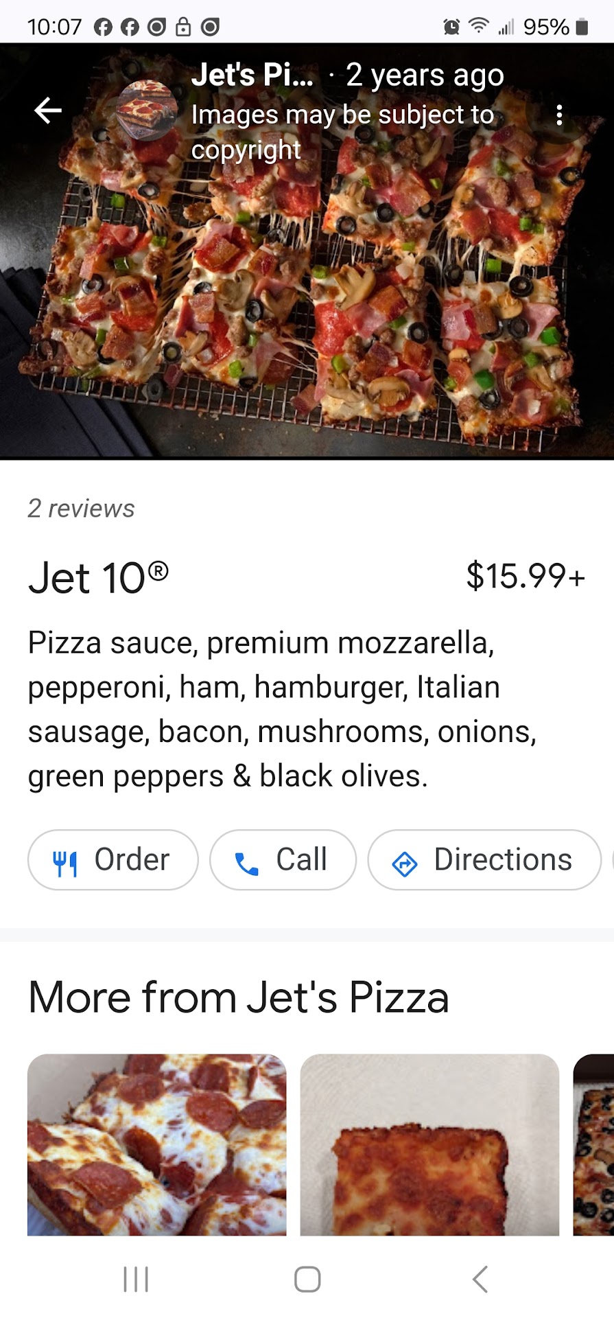 Read moreI have called this place for delivery on three separate occasions after getting off of work and am always told that delivery service has stopped an hour before they close... at 10pm. What kind of pizza joint starts closing down at 9pm, let alone closes at 10pm, when the competition all stays open for a big hungry city till at least midnight. Some of us work long hours and crave some Jet's pizza when we are heading home. Would be nice if they would at least deliver after 9pm to customers who can't stop to enjoy their pizza during the day. Hell... even Dominos and pizza Hut take deliveries up until closing. I have ordered just before closing from both of those businesses and always got my pie... no excuses. Pick up the ball Jet's! Its rolling right by you. $$$$ lost for every customer...