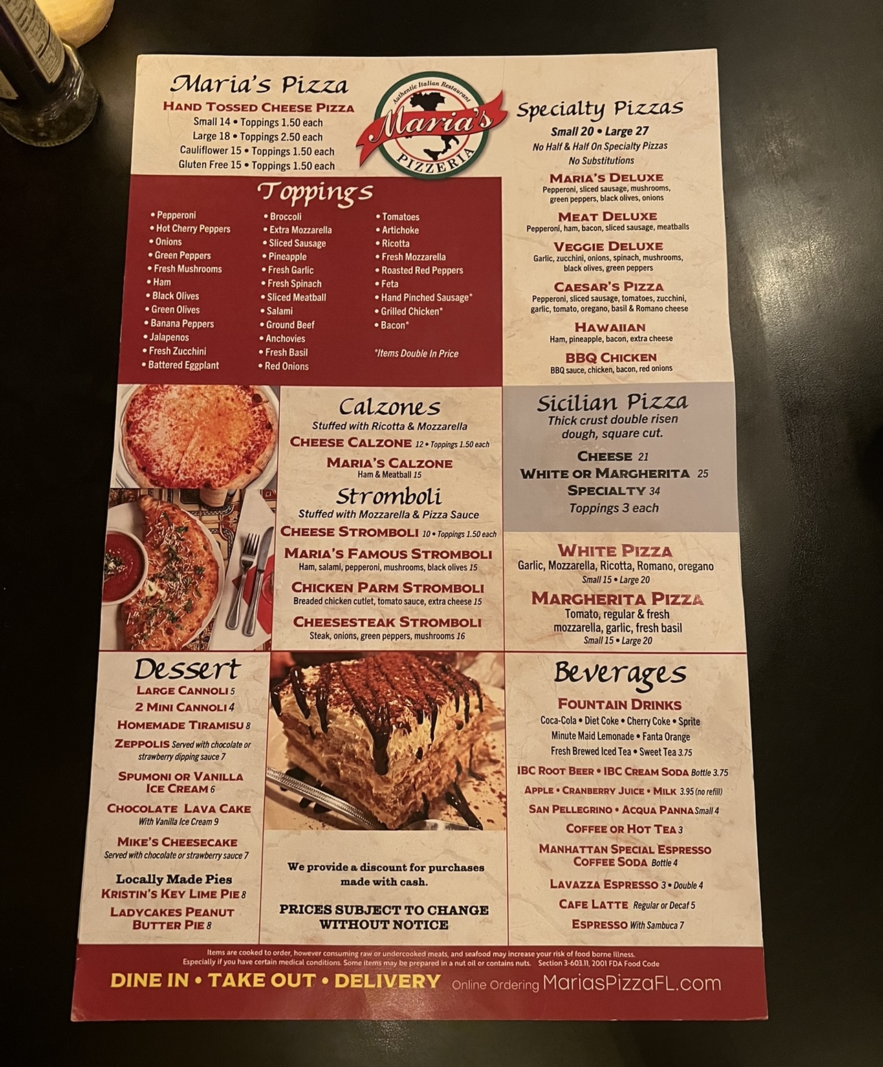 Maria's Pizzeria & Restaurant, SE 46th Ln., Cape Coral, Fl. Here is my 2 cent on the food and chatter.