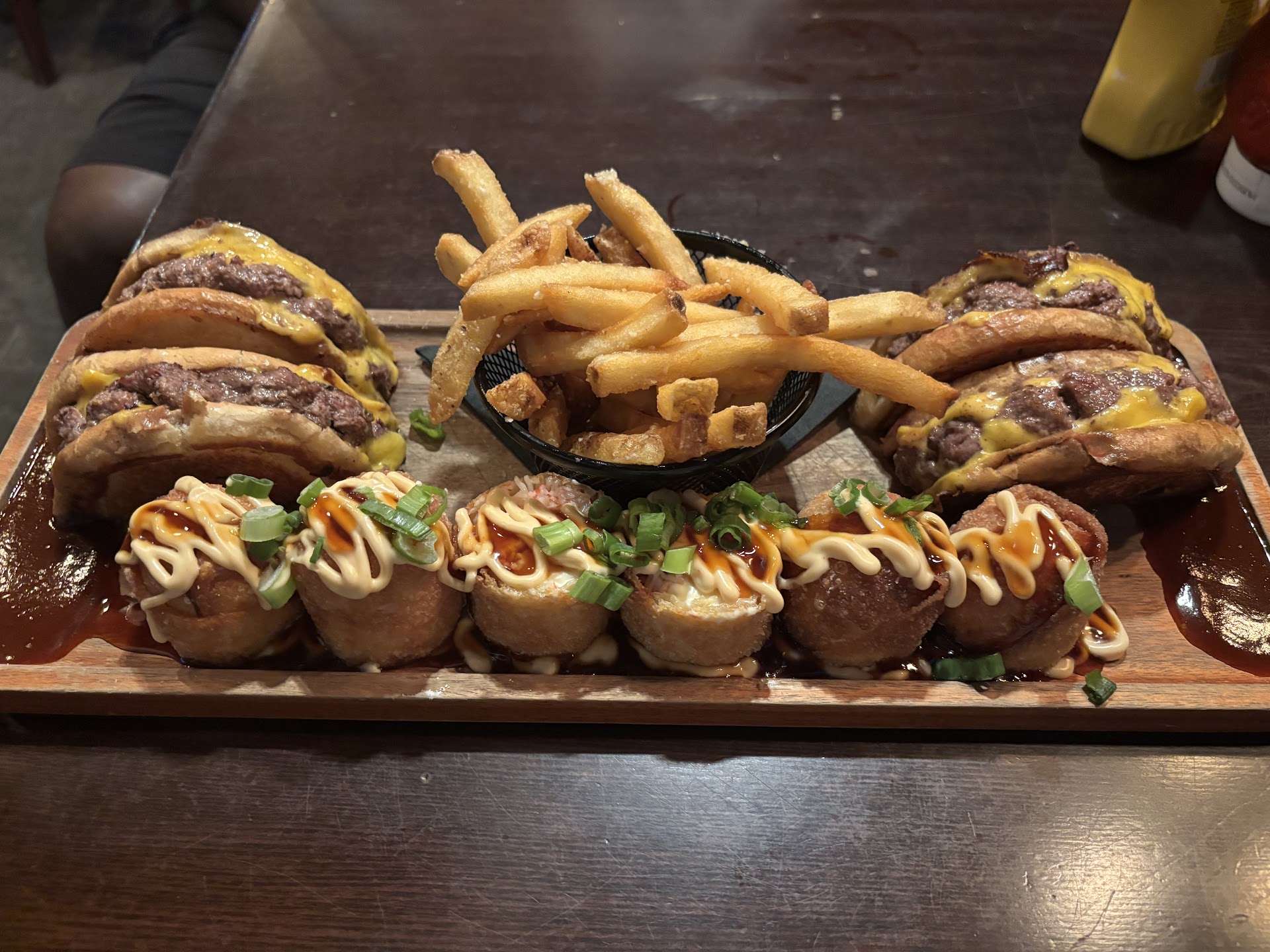 Presentation: Nice presentation to our dish which was the $18 combo of 6 wings and 1 Burger. and we also got an appetizer which was kind of a spring roll with crab meat and cream cheese inside (very tasty) and the presentation was well done! 8 out of 10 rating