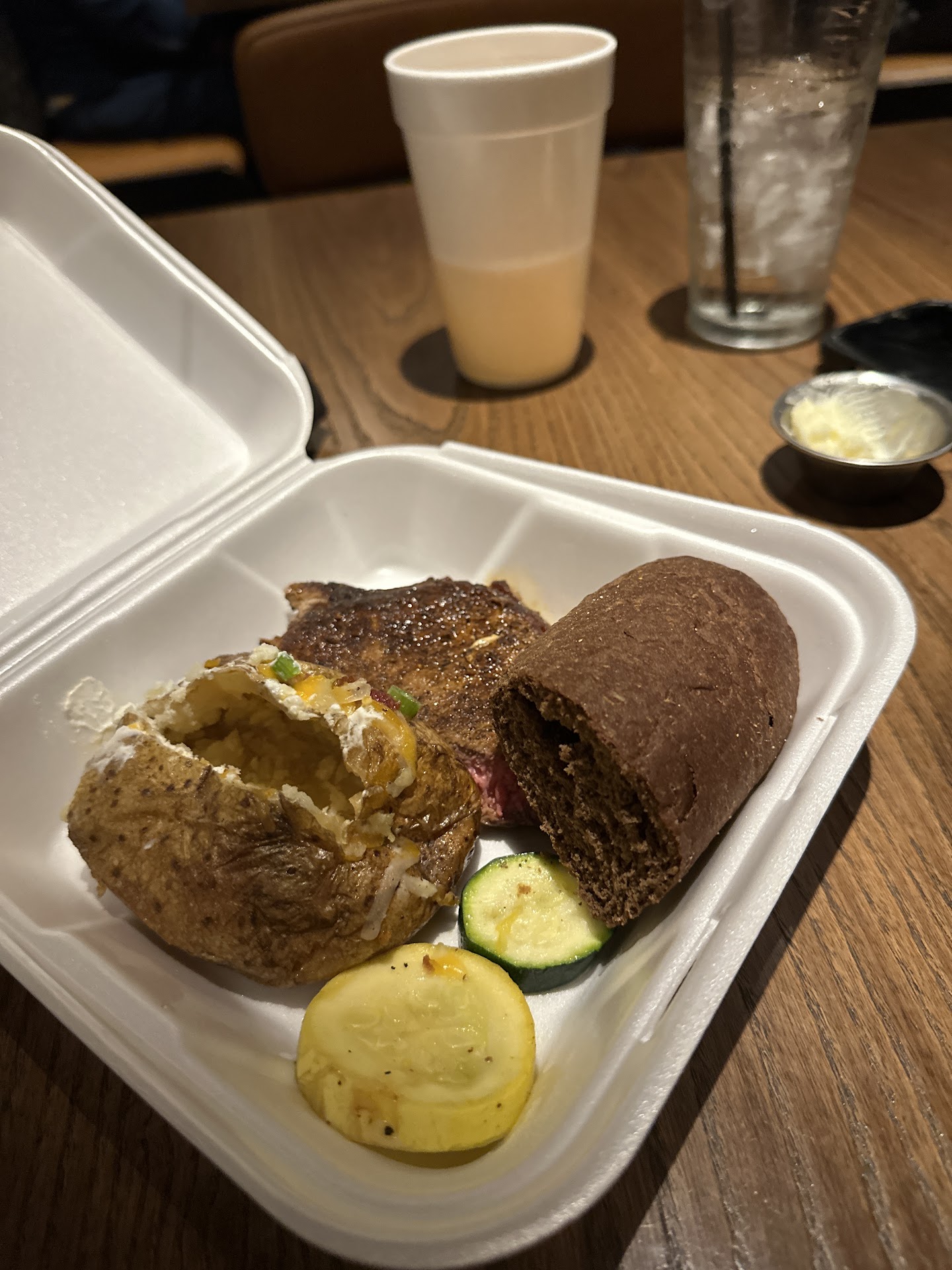 When the steaks arrived, there was no bone.Our server, Olivia, stopped by to check on us, and we pointed it out. She agreed and asked if we wanted different steaks, but we didnât want to wait, so we decided to eat what was served. Unfortunately, the steaks were a bit dry and I forgot to ask them to go easy on the seasoning, which they tend to overdo.