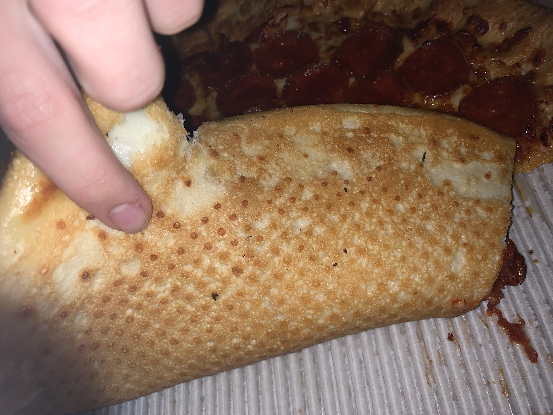 The food....Large,thin crust, pepperoni/mushroom. This pie was 2 inches smaller than the pie you get from Cosxto....The crust was like a old tortilla or pita bread. The topping was mediocre at best though it did cover the pie. Over all a terrible pie....NEVER AGAIN PIZZA HUT.