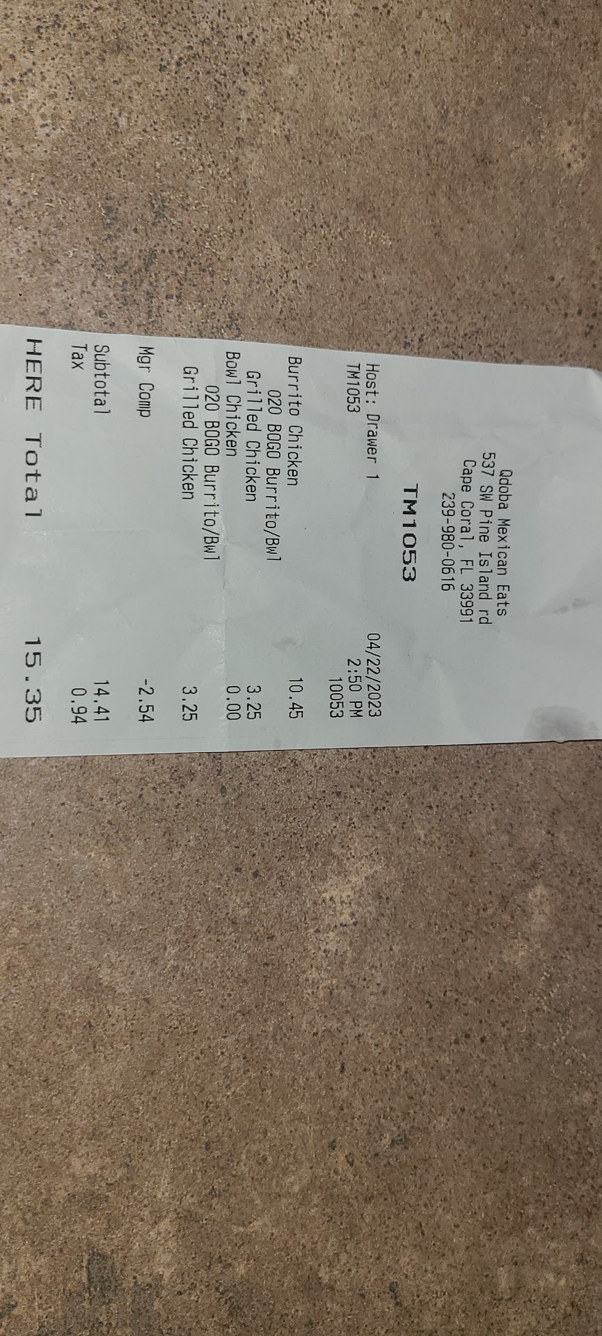 Ā Ā Ā Read moreMy family has enjoyed Qdoba in Cape Coral off of Pine Island rd up until today 8/8/24. Itās been a couple months or so since Iāve stopped in there, must be new management because this experience was very disappointing. All new faces, the young ladies who waited on me were very pleasant and nice but the food quality has gone down. We always get the same thing so I know what burritos used to be and what they are now. Barely any meat and Iām not exaggerating. I asked the girl, is that all the chicken, it was barely a spoonful Now Iām telling you it wasnāt even a full spoon, the girl looked at me and said yes thatās all itās one spoon. I was ordering two burritos and a quesadilla all had barely any meat. And the burritos when rolled were barely bigger than an egg roll. I knew at this point I would not be back. I had a free chips and queso, so I asked for an extra, large, queso (we like queso). I knew I would have to pay for the extra queso. I got home and the large queso cups were only a quarter full. If it was free and a quarter full maybe I would let it slide but I paid full price for one and $2 for the other. Itās unfortunate this has happened. The previous manager who had a European accent and blond hair was super friendly, remembered me and my family any time we went in and made food that was worth what they charged. I understand they need to make money but I no longer feel like $10 plus dollars is worth a tortilla rolled like an egg roll. Oh and I could have had another āspoonā of Chicken for...