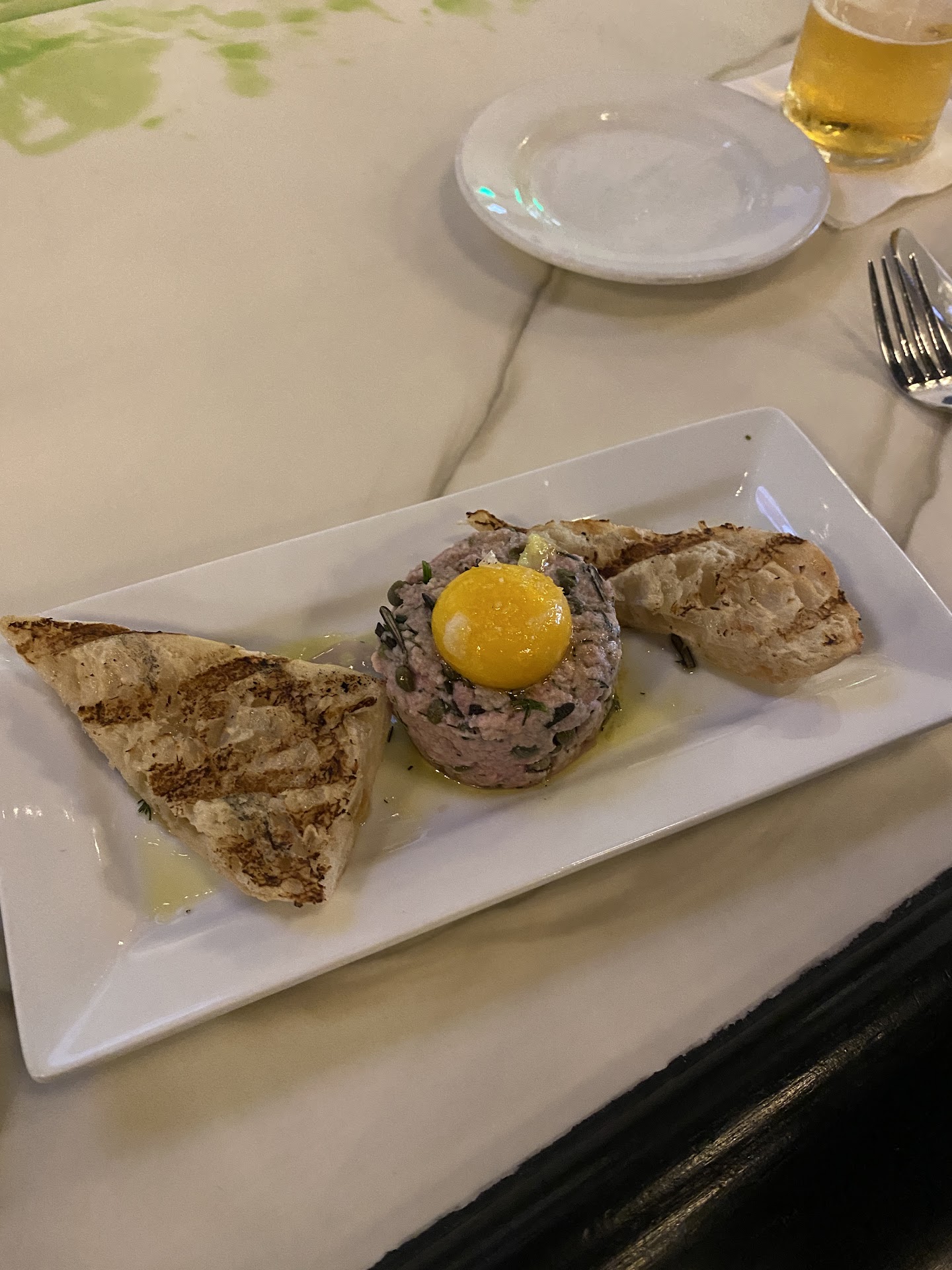 First time in and not our last. Bartenders Andrew and Joey were great. Knowledgeable and attentive. Met the owner and chef. Very friendly, casual and decades of experience. Started with the mushroom app which I forgot to take a pic. Mushrooms you won’t get at most markets. They are blanketed by a savory crepe and a dollop of goat cheese. I’m missing ingredient’s but it’s great. Second app was the lamb tartare. Lemon and capers and a sous vide egg and just great quality and great flavor. Third app was the charred oysters. Nice size and good but, for me, missing the butter and garlic and darker char. Last but not least the lamb burger. Medium rare, pancetta, smoked Gouda cheese. Fantastic! Last words… do not feel like you are underdressed. The environment and staff make it very causal and it will be well...