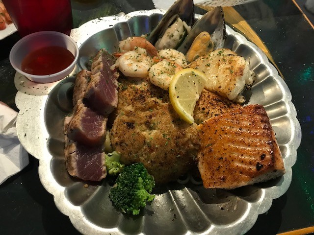 The food and extras they give me, We share fried zucchini plus given some fried garlic bread, excellent. I had a special of shark and angel hair pasta with garlic sauce. My wife the Trio, shrimp, grilled scallops and Maryland crab cakes . As always they met and exceeded my expectations. Of course the Irish cannoli's and free Amaretto drinks. A wonderful dessert drink. Two things were substandard, the cole slaw, no big whoop plus the AC was lacking. Though a fan was directed my way. Overall outstanding service and food. A must try place.