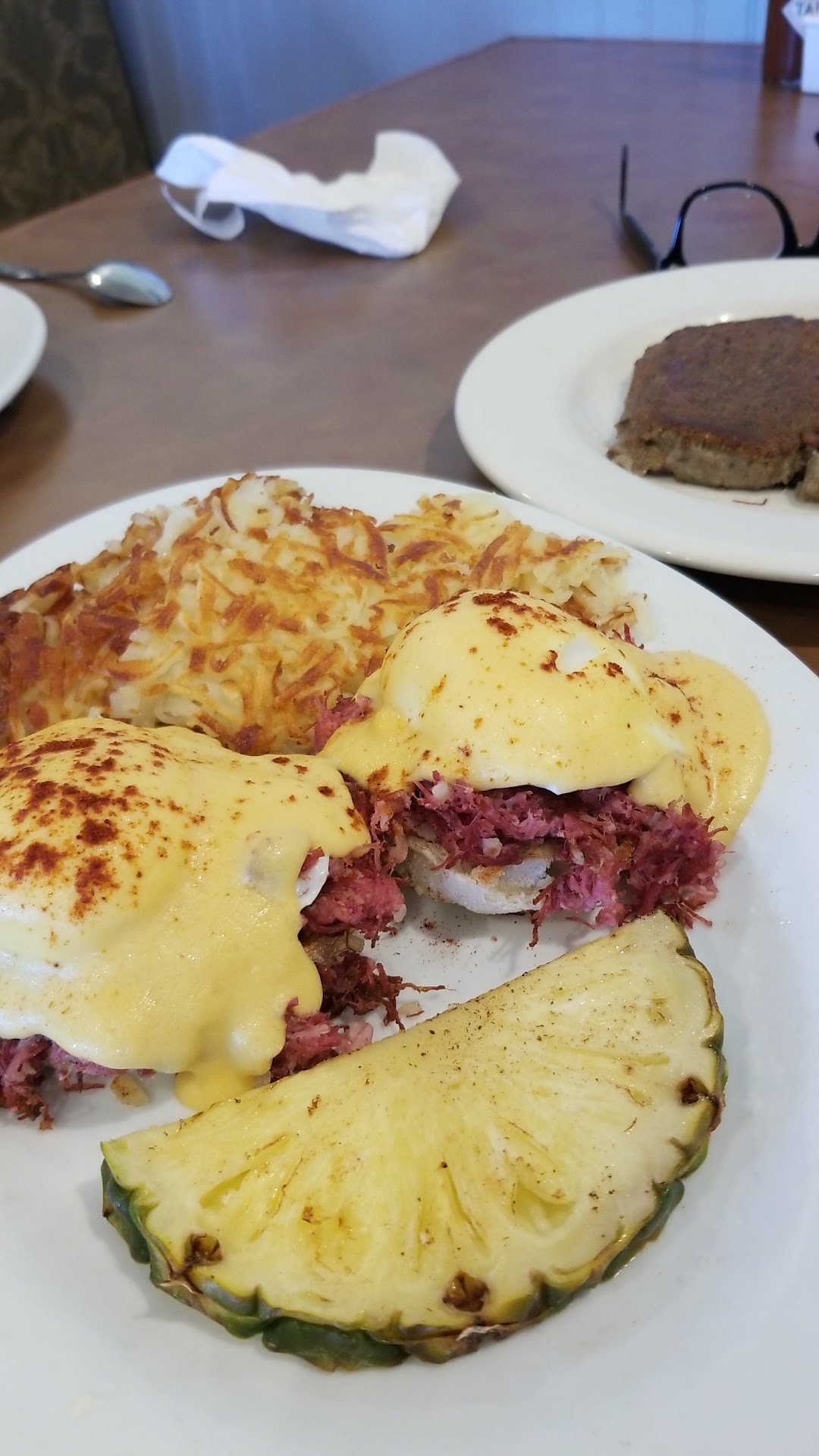 First time eating here. Nice large dining area and able to be socially distanced from other tables/booths if you're concerned about this. The two servers were both friendly and attentive. But, neither was wearing a mask 🤔 The breakfast and lunch menus have lots to choose from. I had coffee and my wife had the fresh brewed iced tea. Both were good. $2.50 for each but refills were included. Steep for drinks but this is how restaurants make their money, so it is what it is. Refills were offered when our drinks went low. Food arrived quickly and cooked perfectly. Flavors were great and portions were just right. My Eggs Benedict had perfectly cooked eggs. They have several different Eggs Benedict other than the standard. I had the Irish Eggs Benedict which had corned beef. It was delicious. My wife had the Monte Cristo Sandwich which I tried and it was tasty as well. Their French fries have a house seasoning on them that gave them great flavor but not too strong and overly salty. All and all a nice place to eat with many food options to choose from. Hoping they might reconsider their use of masks until Covid is a thing of the past 😷