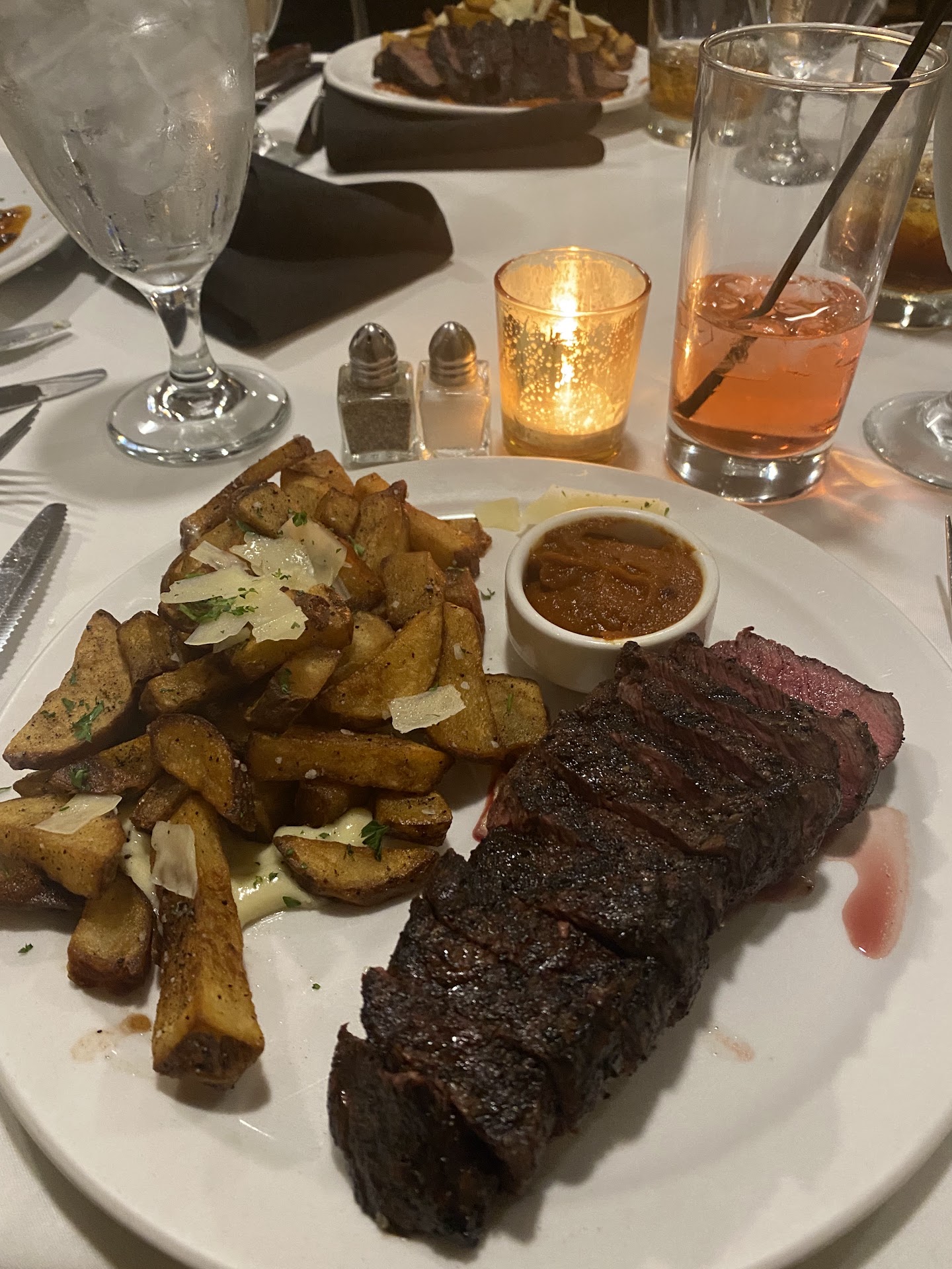 The food was mostly good. The cocktails were excellent. My wife's food was excellent. The $75 steak was "fine" but not cuttable like "warm butter" as described. Why complain about a steak that has already been cooked? The steaks I buy at Schnucks are better than what was served this evening (which is a tremendous bummer since those steaks at 36 are the top 8%). Lots of leftovers to take home. Even gifted a slice of cake for our anniversary. Thank you!